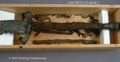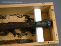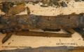 ... blottades vid k strax norr om högaltaret en träkista, så multnad att inte någon del av densamma kunde upptagas hel, men däremot var konturerna delsvis skönjbara genom den svartbruna randen i jorden efter trät. Den överliggande jorden borttogs med försiktighet och skelettet började bli synligt, så man samtidigt härmed varseblev ett ovanpå detta liggande svärd, vars fäste låg uppe vid kraniet. D...