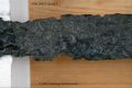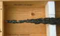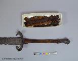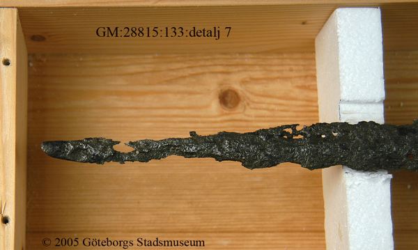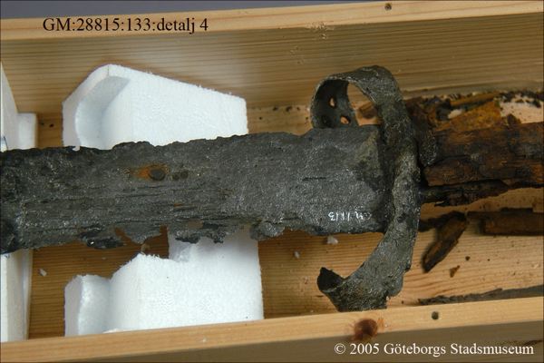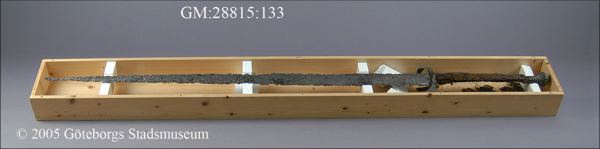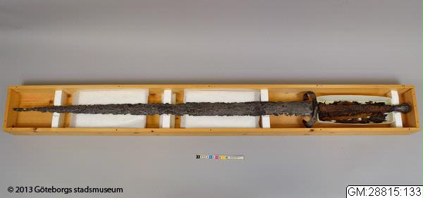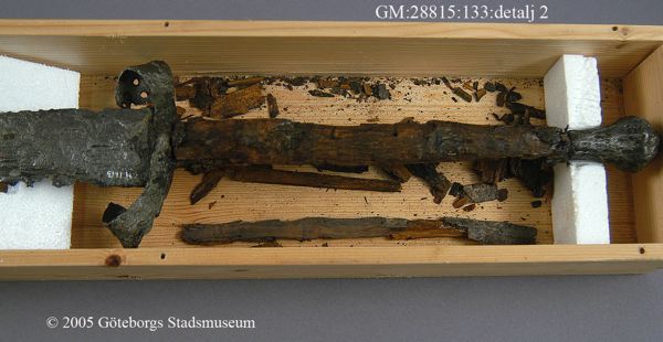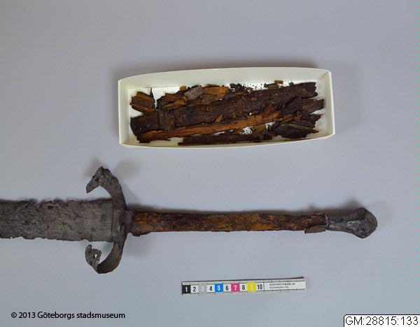 ... blottades vid k strax norr om högaltaret en träkista, så multnad att inte någon del av densamma kunde upptagas hel, men däremot var konturerna delsvis skönjbara genom den svartbruna randen i jorden efter trät. Den överliggande jorden borttogs med försiktighet och skelettet började bli synligt, så man samtidigt härmed varseblev ett ovanpå detta liggande svärd, vars fäste låg uppe vid kraniet. Det var visserligen betäckt med fastklumpad jord och rost, men i övrigt väl bibehållet, och upptogs fullkomligt oskadat till alla delar. Därefter plockades jorden upp ur kistan runt skelettet, men trots all använd möda, hittades inte något mer; skelettets delar upptogs sedemera att förvaras särskilt för sig, något som även i övrigt iakttagits med alla dylika, då sådant varit möjligt. Vapnet är ett tvåhandssvärd med en längd av 1,29 meter, därav klingan 0,97 meter, under det fästet 0,32 meter. Klingan, som är tveeggad, är bredast uppe vid fästat eller 54 mm och smalnar därifrån jämt avtagande ned till spetsen. Den har varit mycket skarp och utan synbar rygg, samt tämligen tunn; största tjockleken nära fästet är 6 mm.