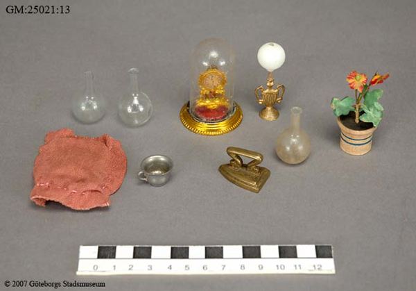 Dockskåpsföremål bestående av fotogenlampa, bordsklocka med glaskupa, tre stycken kemikolvar, ett strykjärn, en blomkruka, en kudde och en bägare i tenn.