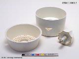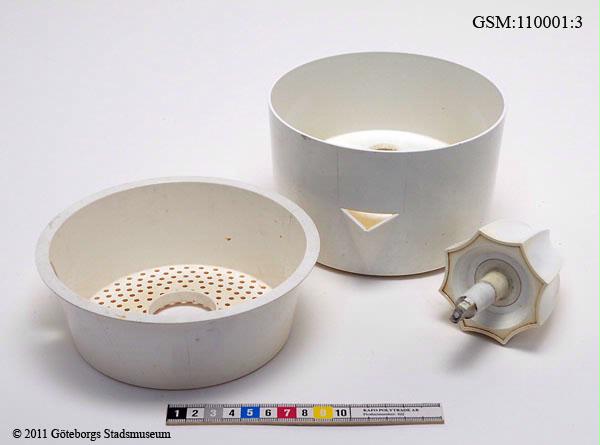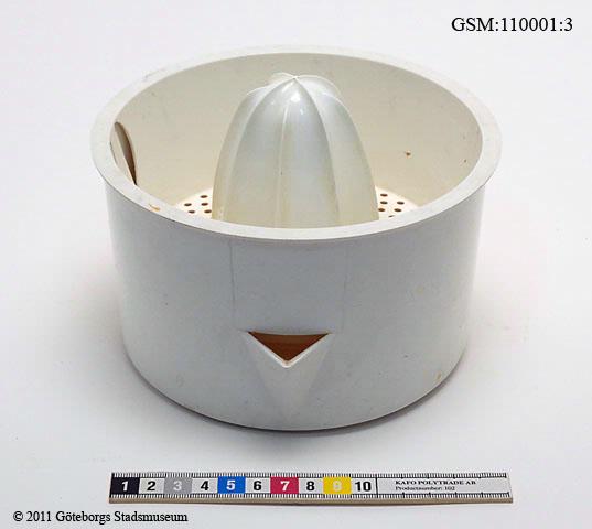 fruktpress, för citron eller apelsin, av plast, med hällpip, sil och bunke.