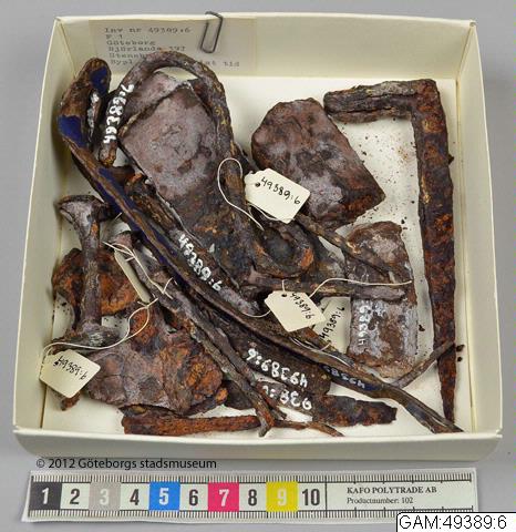 Ett stort antal föremål varav flera spikar och nitar, samt annat som ser ut att komma från historisk tid. Ett skaft till något föremål med rester av blå emalj, ett hål i ena änden och rester av nitar i den andra.