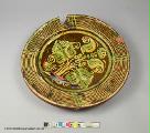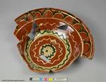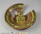 Blandade skärvor från bl.a. fat och skålar i dekorerat rödgods.En del skärvor har blivit hoplimmade till kärl, se underobjekt.