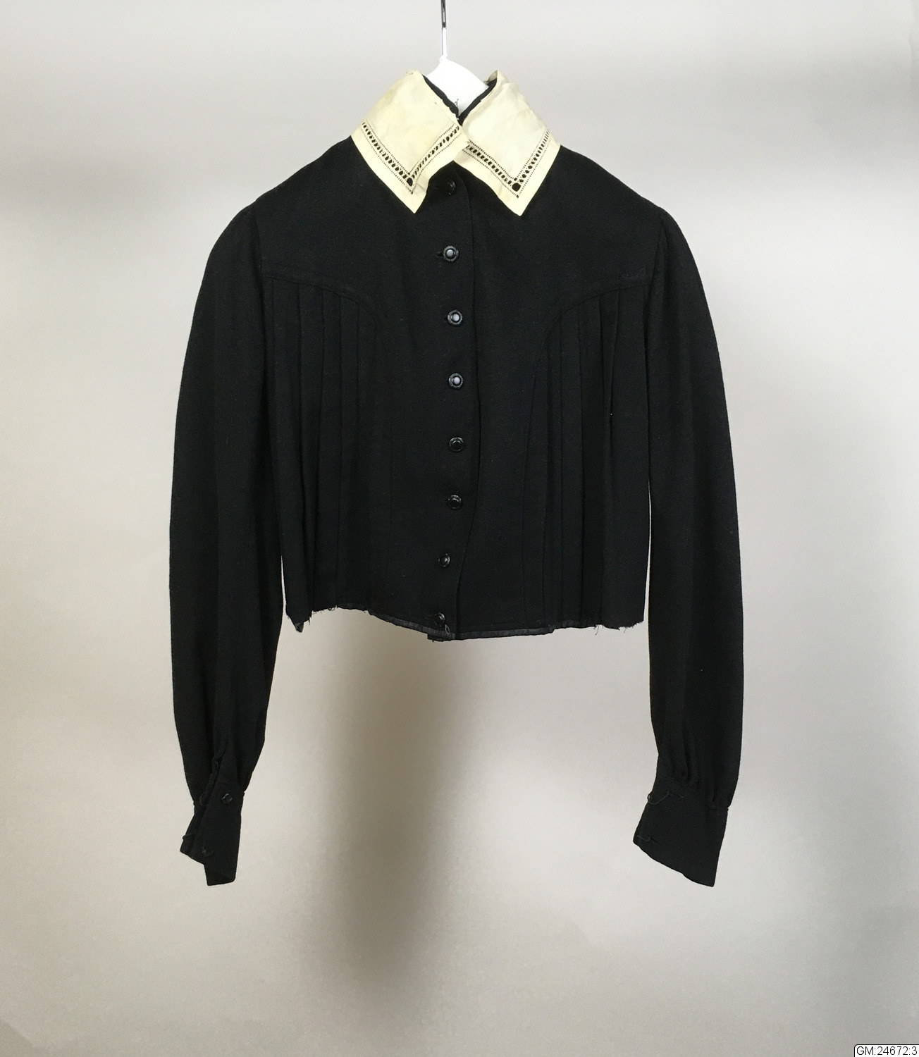 • GM:24672:1-3: klänning av svart kläde, två liv med ståndkrage och 1 kjol.