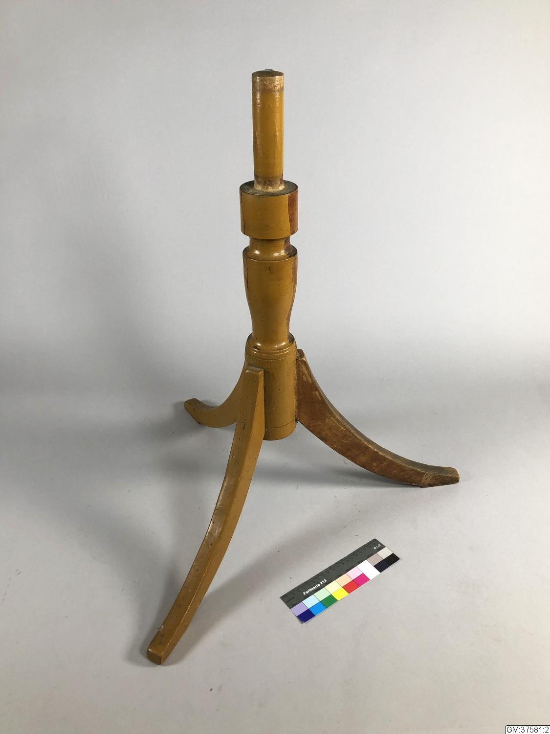 • GM:37581:1-2 = Fällbord i två delar.#1/Rund bordsskiva, trävit (avslutad) med rester av färg på undersidans kanter. På undersidan mellan två säar är fällmekanismen av trä monterad: fyra ståndare med avfasade hörn mellan en övre kvadratisk skiva och en undre med avfasade hörn; båda har runda hål för att passa till pelarfoten; målad i senapsgult.#2/Pelarfot med tre utåtsvängda fötter. Målad i senaps... Visa hela