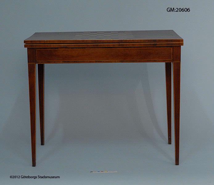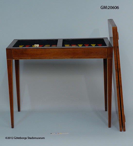 • Spelbord med utvikbar skiva i sengustaviansk stil. På ena halvan finns ett schackbräde. Stomme i furu som fanerats med valnöt, ebenholts, palisander och buxbom. Backgammonspelet i möbelns sargutrymme ... Visa hela