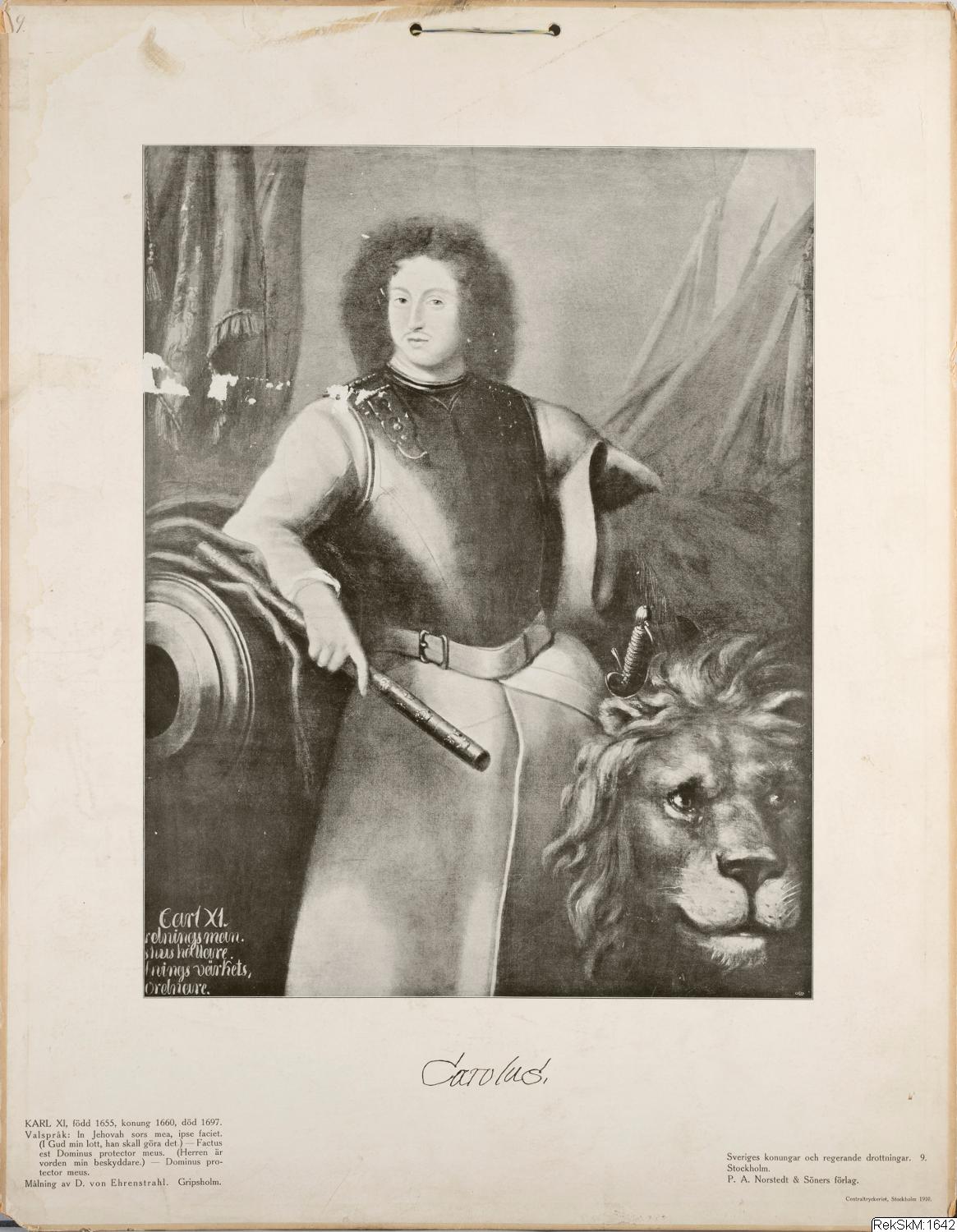 Bilden föreställer kung Karl XI, iförd kyller(en militärrock av älgskinn som bars under harnesken) och harnesk (bröstplåt), stående med högra armen stödd mot en kanon. Till höger i bild ett lejon, i b...