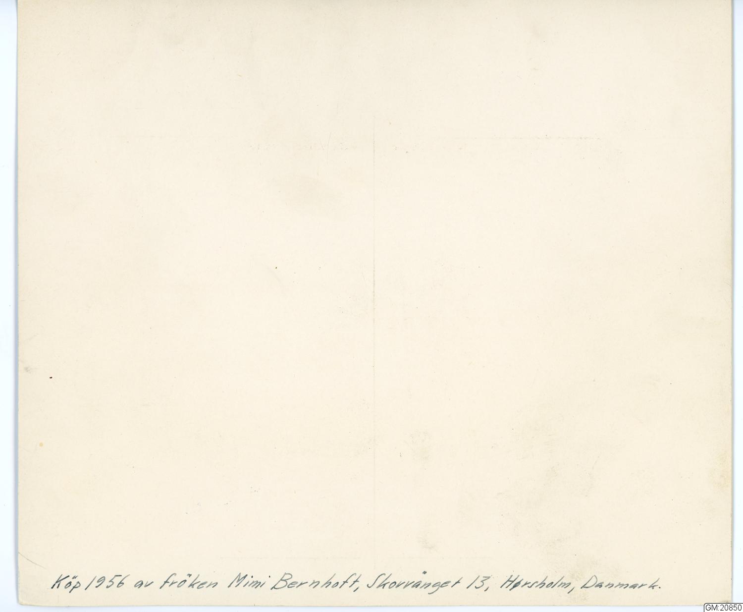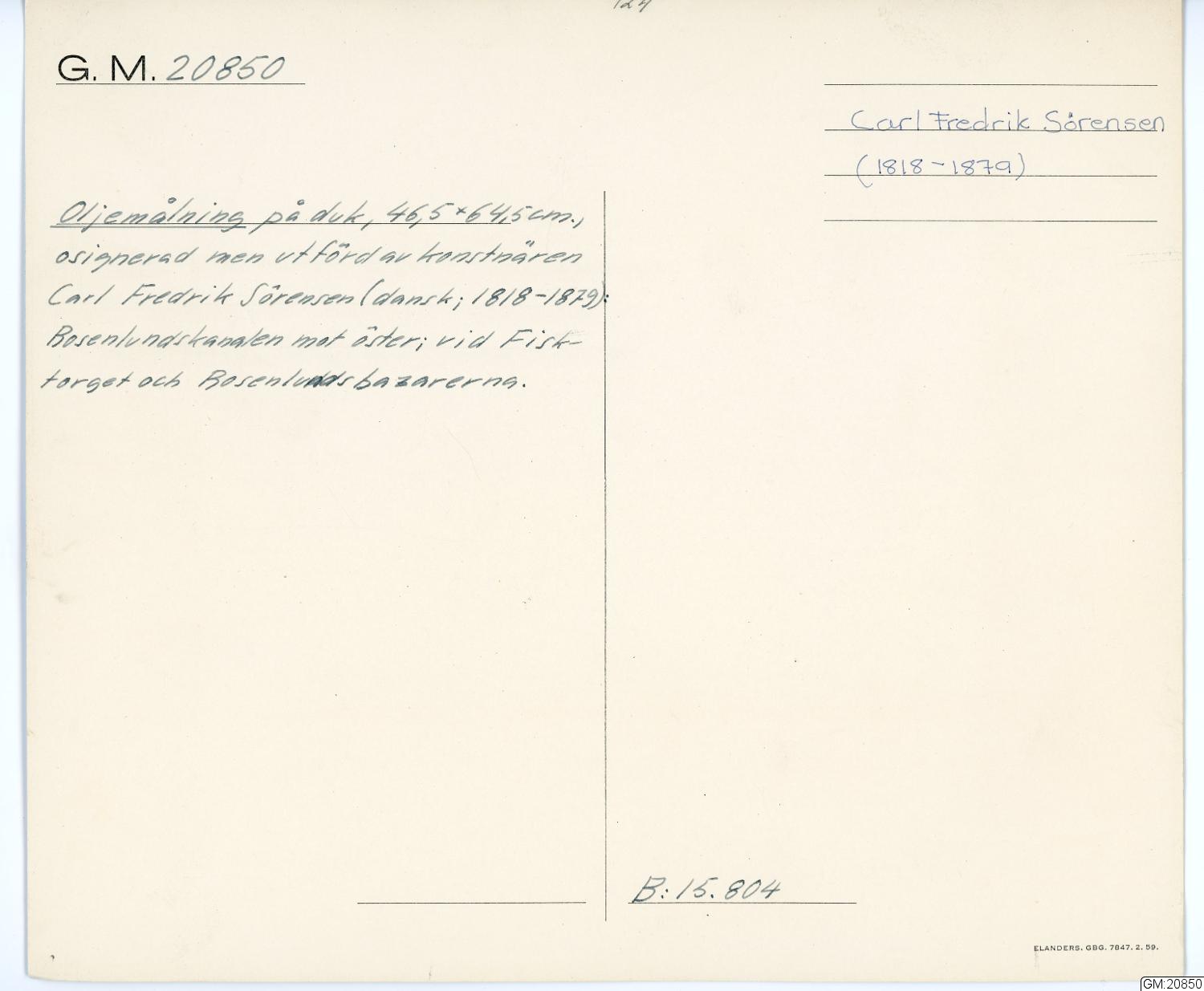 Fröken Bernhoft i brev till överstinnan Wanda Tarras-Wahlberg (Gbg) d. 12/3 1956: ..."Jeg har et Maleri af Marinmaler Sørensen - arvet efter mine Besteforeldre, som forestiller Göteborgs Havn for cirka 100 Aar siden..."; I annat d. 23/5 s.å.: ..."Det er mig umulig at finde nogen Signature. Jeg formoder at min Bestefader Hergaard (?) har købt Billedet paa Auktion efter Sørensen..."
