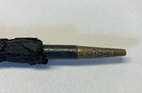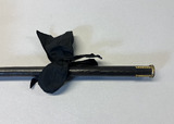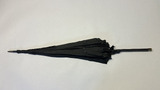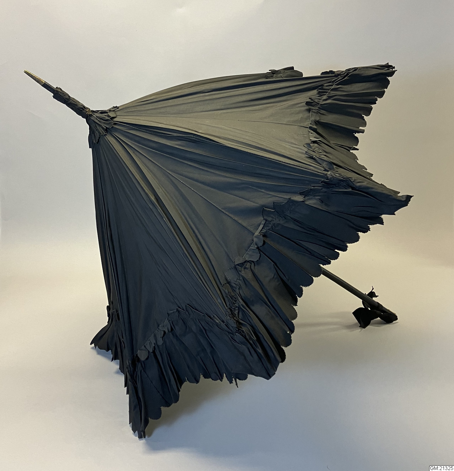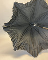 • Parasoll i svart siden med uddklippt volang i ytterkanten. Stomme i metall och skaft i trä. Handtag i mönstrat mörkt trä med iläggningar i mässing. Doppsko i i metall med präglat mönster. Rosett i sva... Visa hela