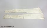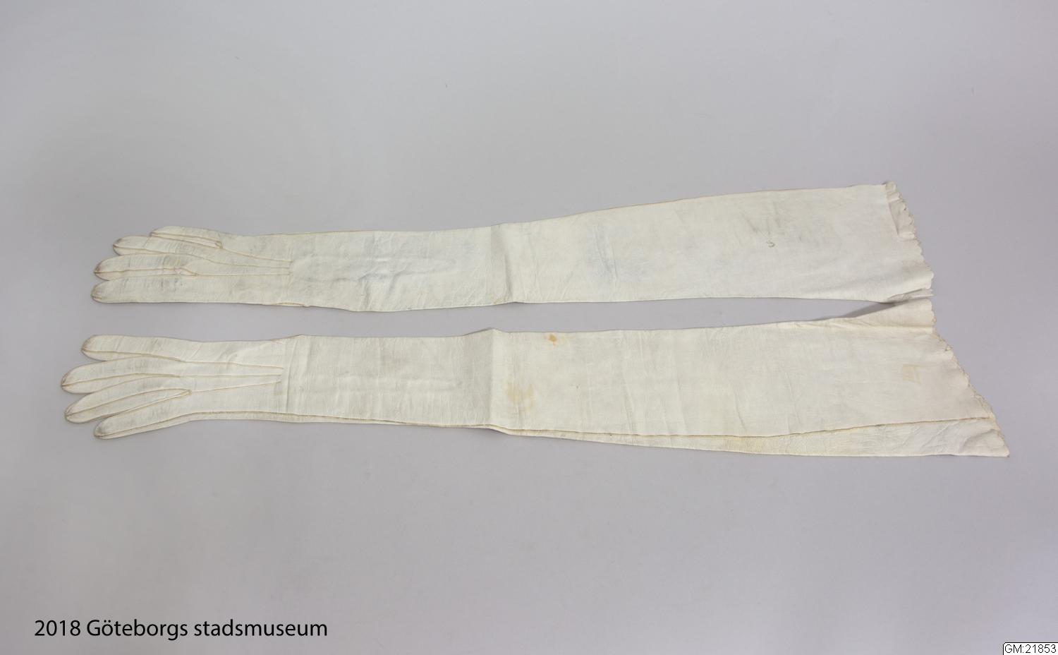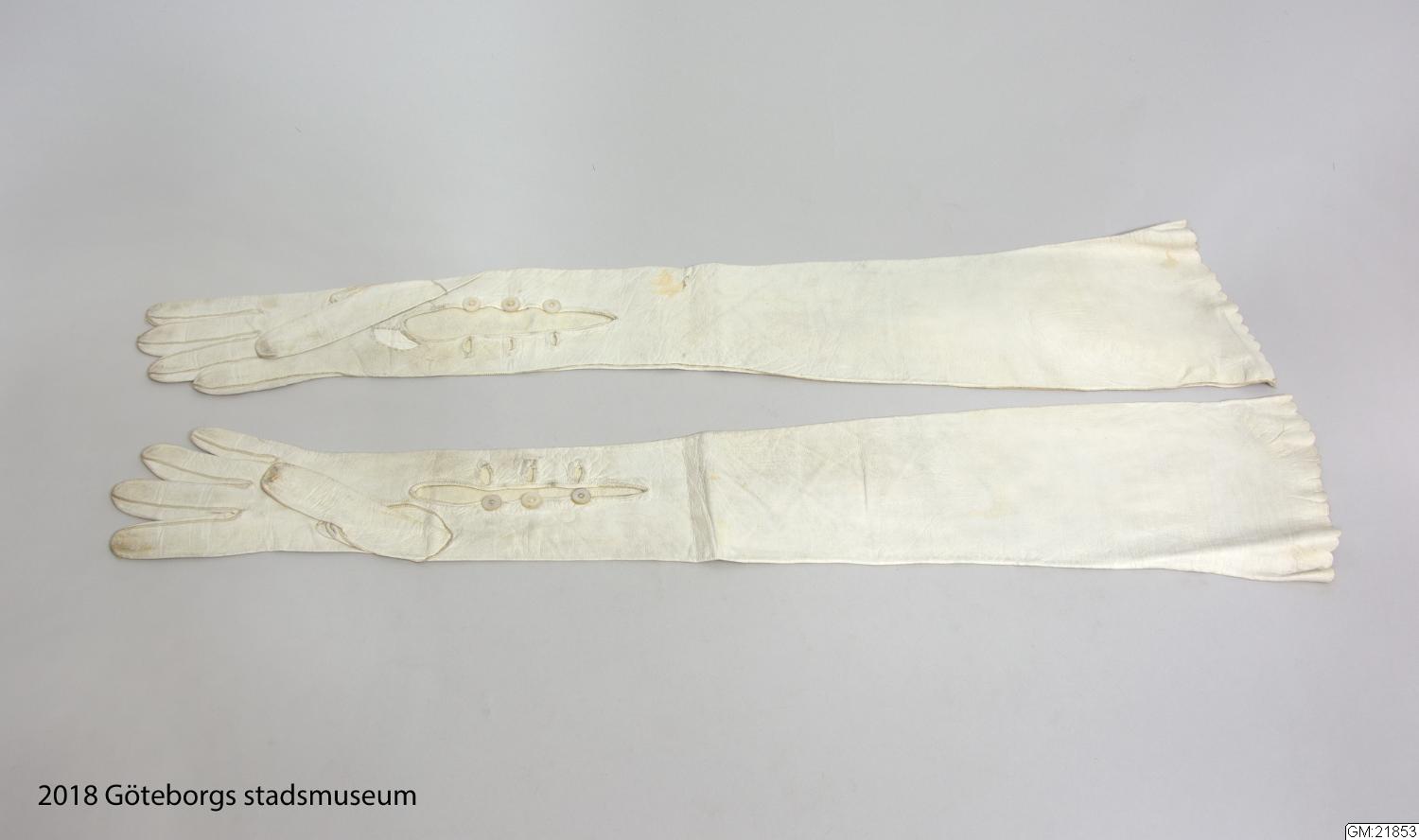 Från katalogkort: Handskar, ett par, av vitt glacéskinn, knäppning vid handleden med tre knappar och knapphål, avslutning med uddig kant.