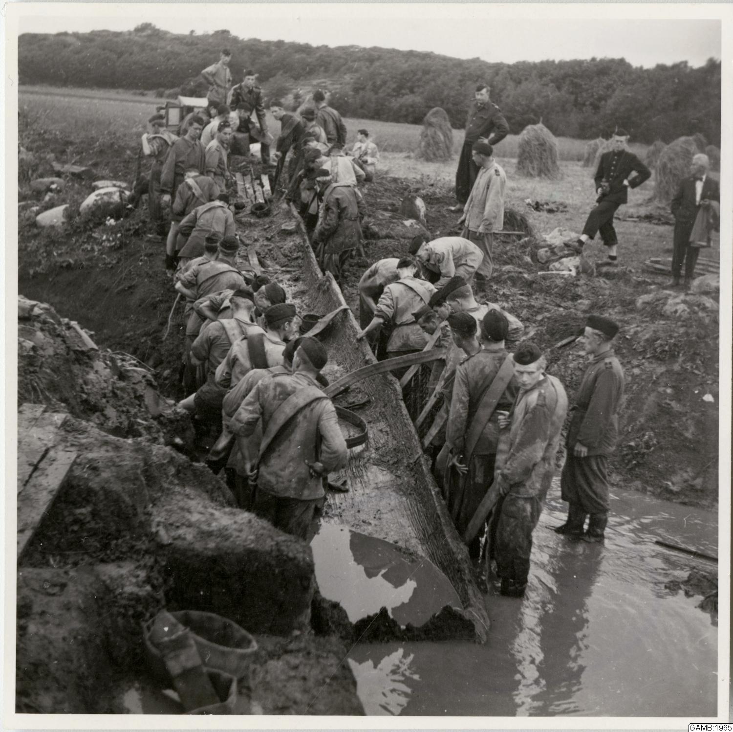 • Stockbåten i Kvillehed lyfts av 28 man och dras upp av en jeep med vajer fäst i båtens för. Männen som hjälper till med lyftet är från flygflottiljen F9.