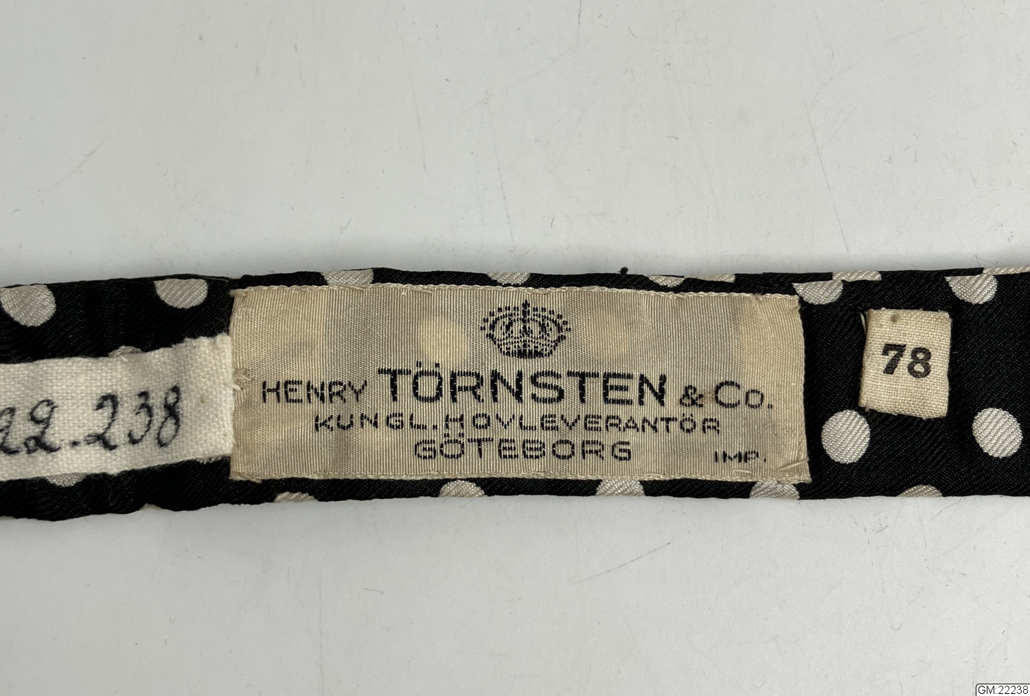 • Svart fluga med vita prickar att knyta själv. Firmaetikett från Henry Törnsten.