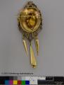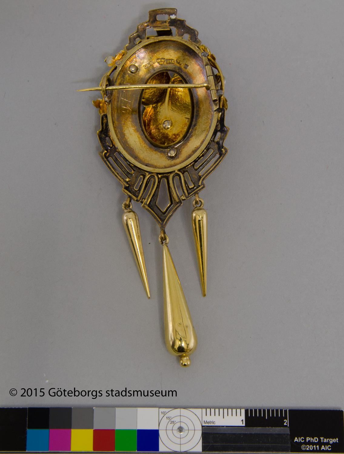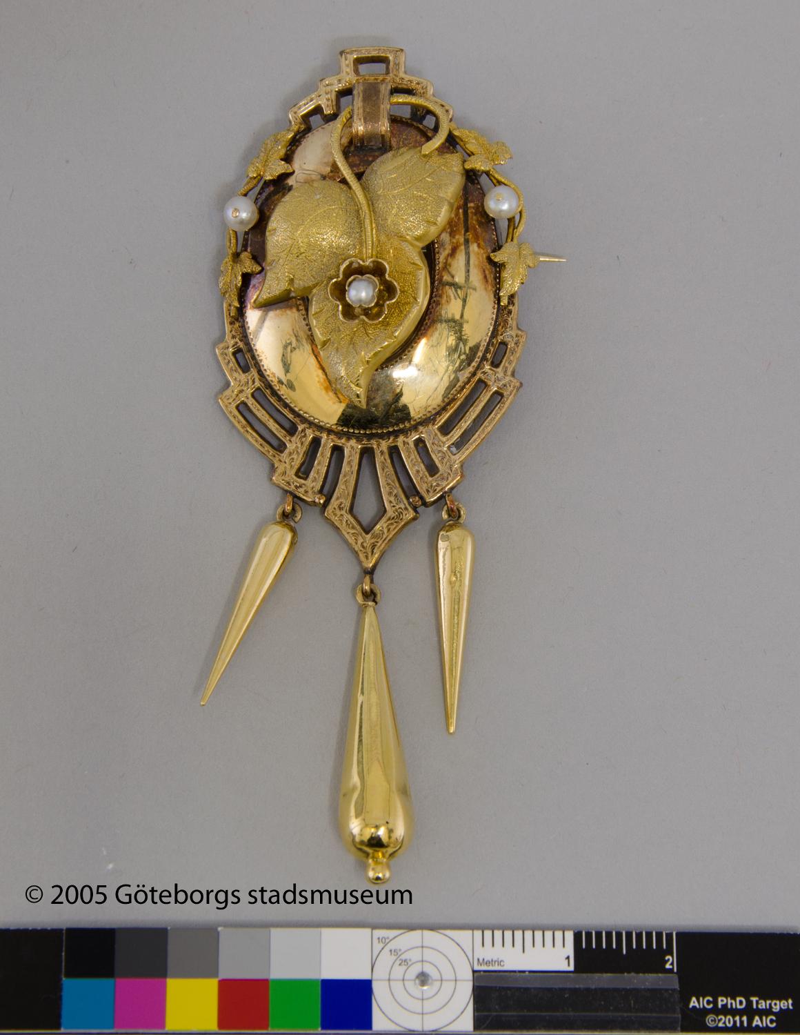 Katalogkort: "Brosch av guld, försedd med tre små pärlor. Oval form, dekorerad med naturligt utförda löv, nedtill tre droppformiga kläppar. H.(med kläpp) 9 cm Br. 3,2 cm Stämplar: CD&Co, tre kronor, 18K, W5 (=1875), M Gustaf Dahlgren mästare 1845-1875 Gustaf Dahlgren & Co Malmö 1875" [Enligt katalogkort]