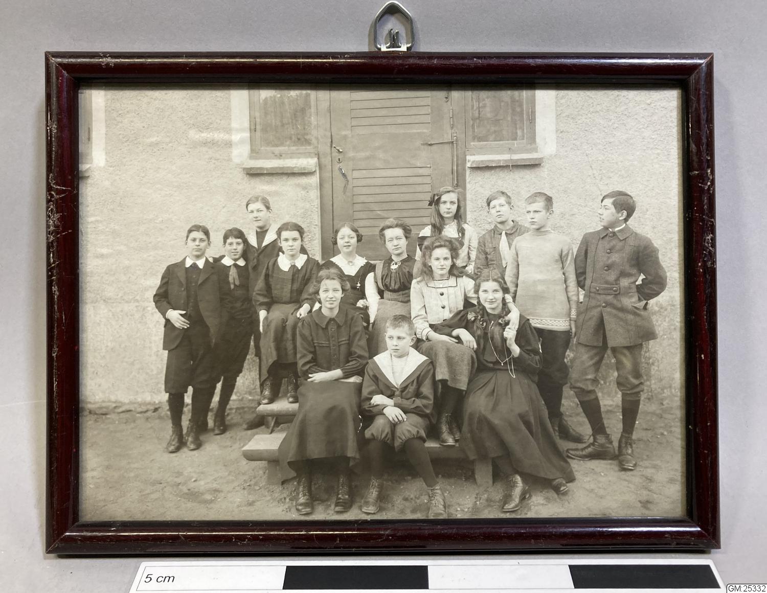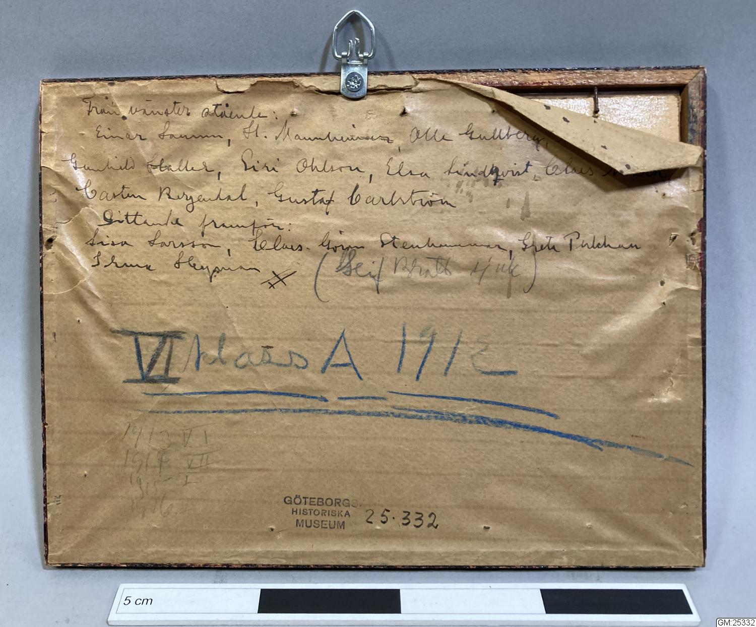 Gruppfotografi föreställande klass 6A på Samskolan, år 1912. Från vänster stående: - Einar Lamm - Henrik Mannheimer - Olle Gullberg - Astrid Barkman - Gunhild Haller - Siri Ohlson - Elsa Lindqvist - Claes Mark - Casten Bergendal - Gustaf Carlström Sittande framför: - Lisa Larsson - Claes Göran Stenhammar - Greta Pulehau - Sture Heyman (?) (Leif Bratt sjuk)