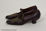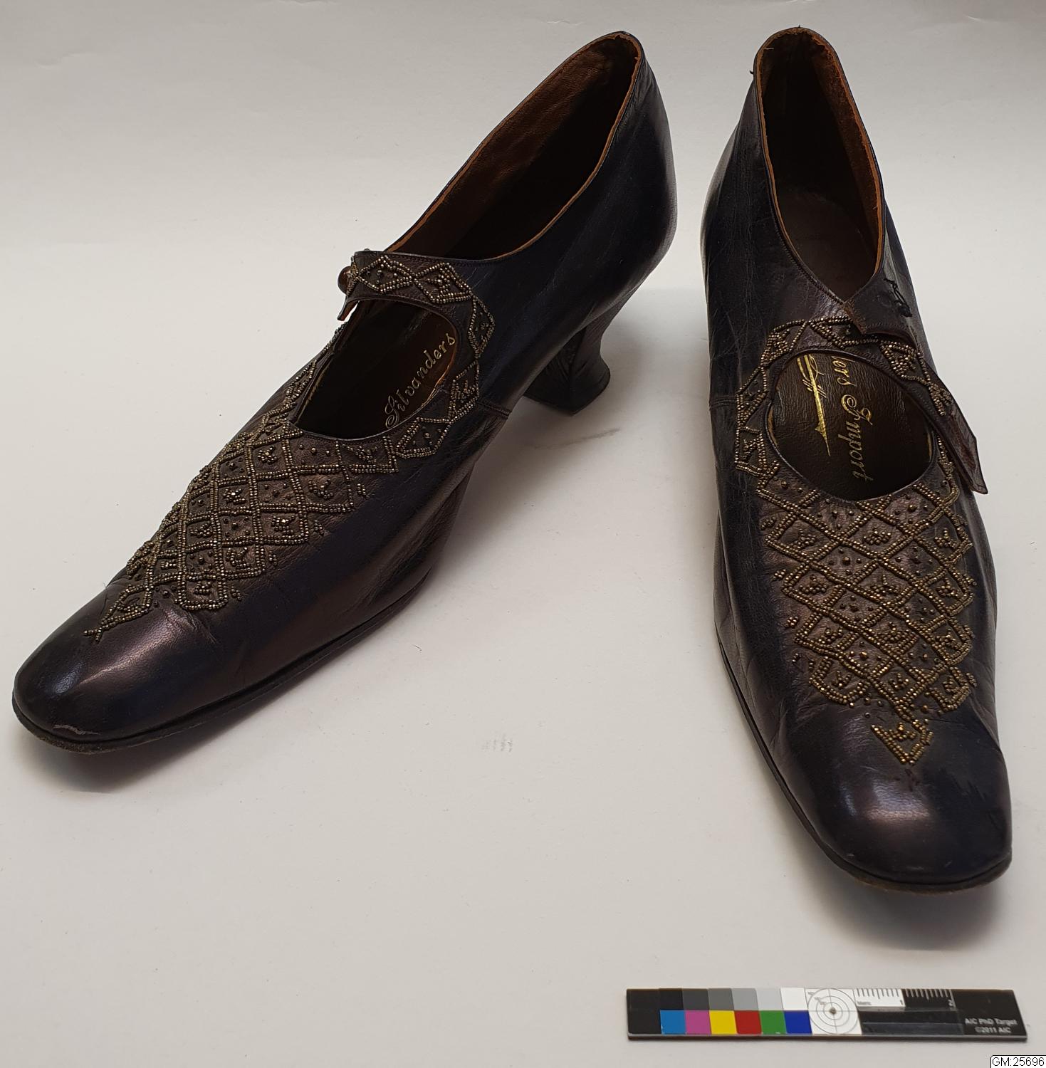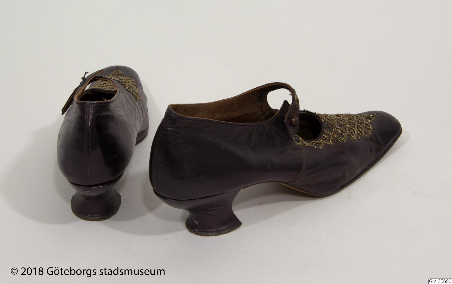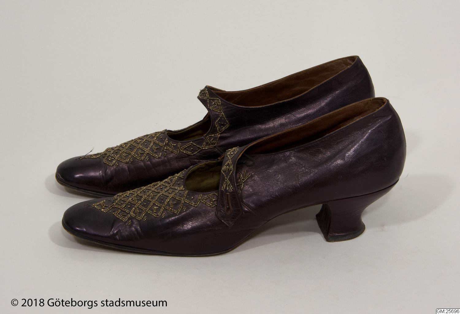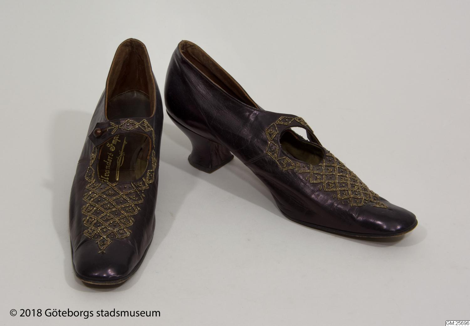 Från katalogkort: Damskor, ett par. Pumpsmodell med sleif och svängd klack. Av anelinfärgat skinn, på framkappa och sleif broderi med små guldfärgade pärlor. Bakkappa fodrad med brunt skinn, framkappan med brun bomullssatäng. Firmamärke: "Silvanders import". Längd 29 cm.