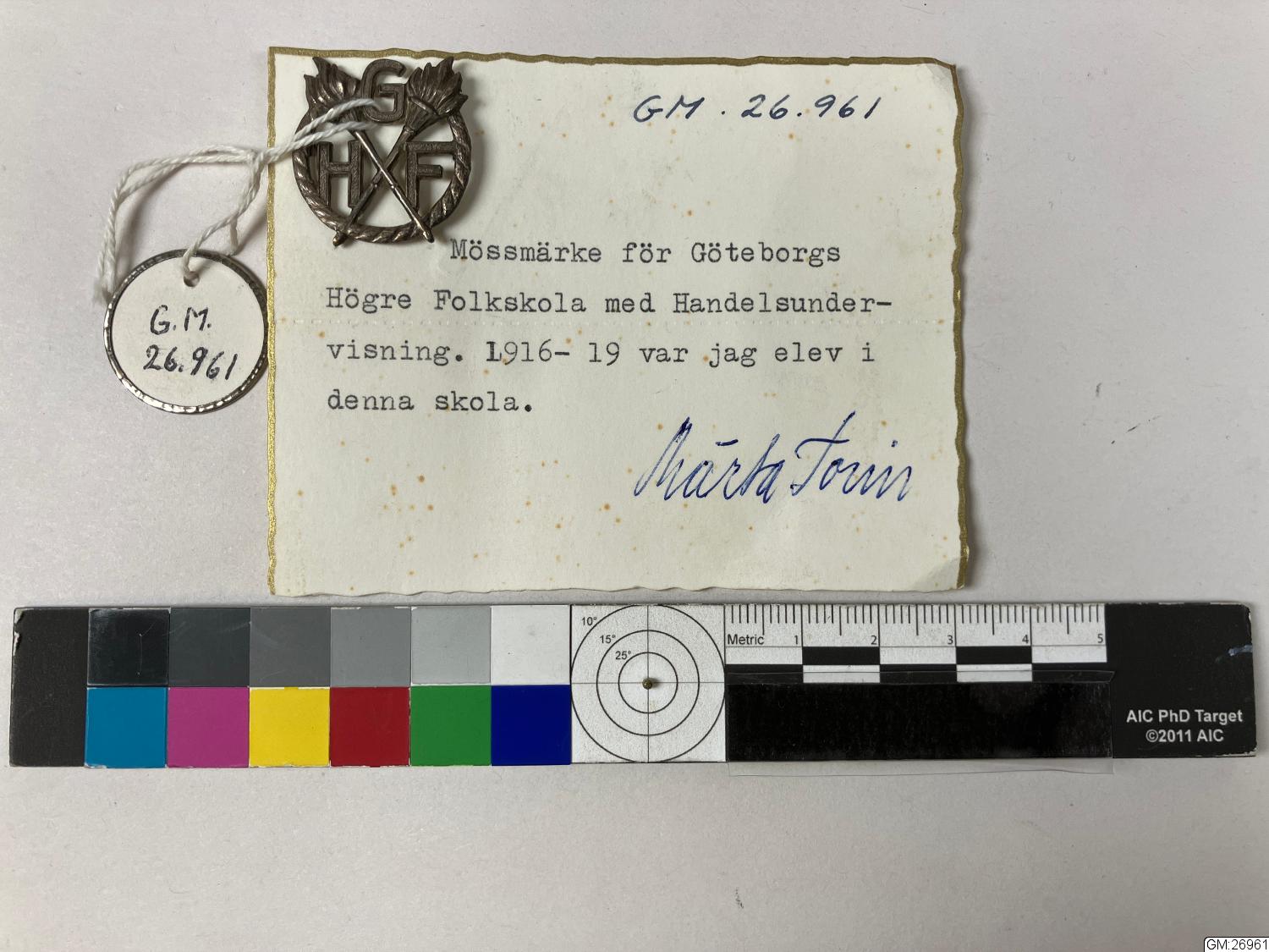 • Ett mössmärke frGöteborgs Högre Folkskola med Handelsundervisning. Märta Torin studerade där 1916-1919
