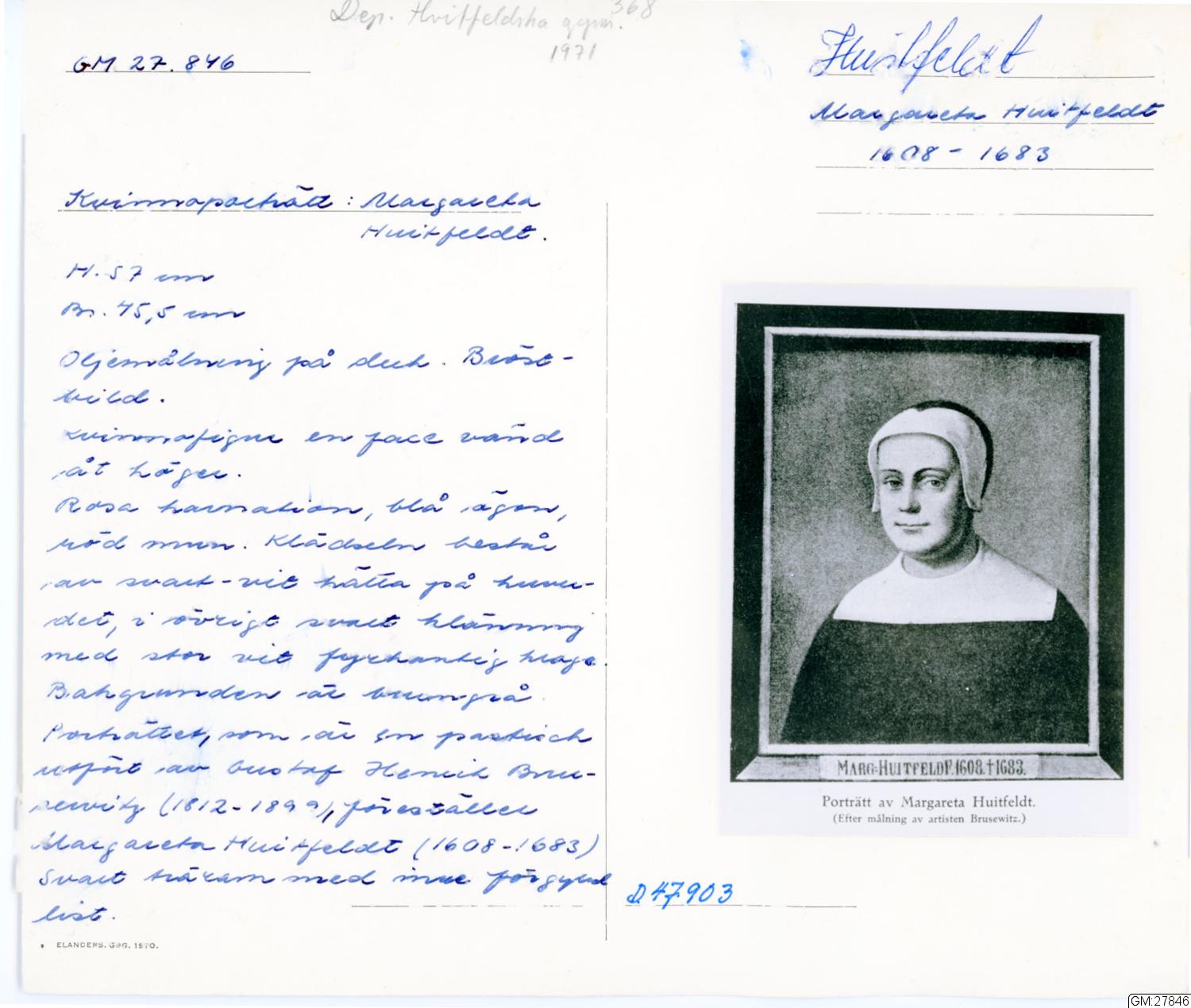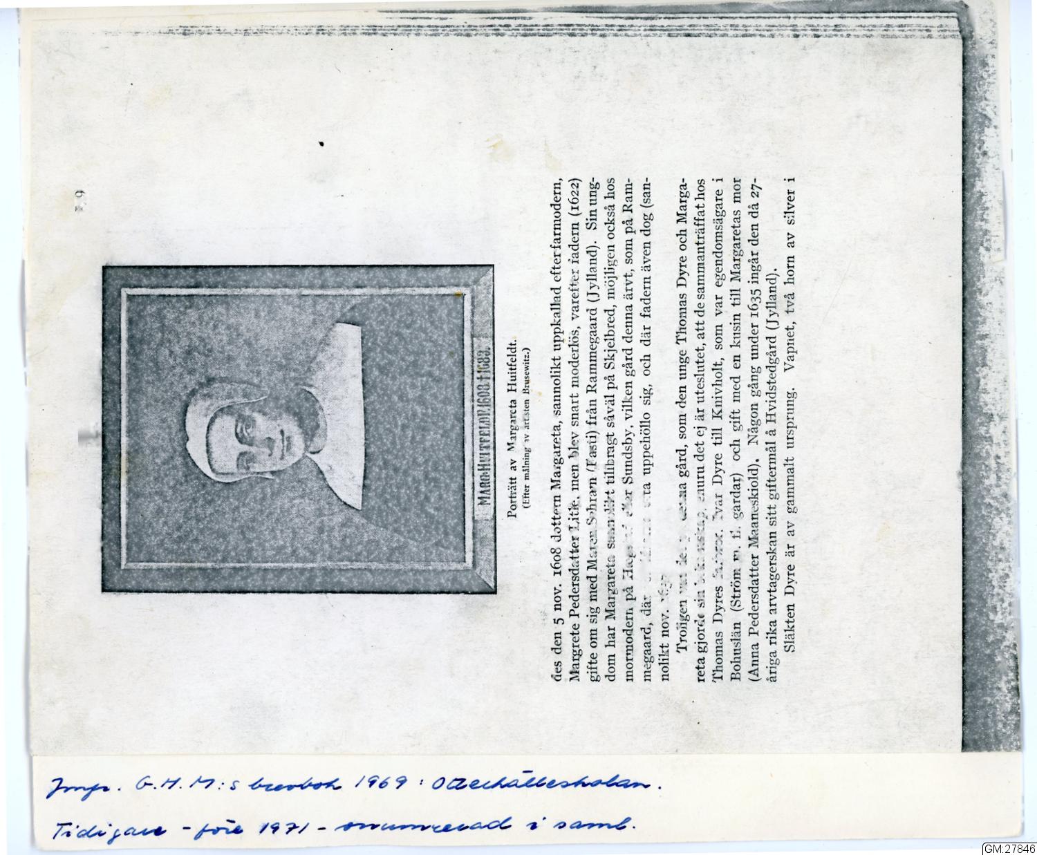 Oljemålning, porträtt föreställande Margareta Huitfeldt (1608-1683), klädd i svart dräkt med vit fyrkantig krage och svartvit hätta, möjligen änkedräkt. Kvinnoporträtt, en face, bröstbild, polykrom, pastisch. Duken på fäst på spännram, med enkel svart träram med förgylld list närmast målningen. Förgylld namnskylt. Dagermått 57 x 68 cm. Se även G. H. M:s brevbok: Otterhälleskolan sid 170