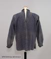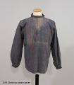 Shirt for a laboring man, made of sturdy blue cotton with thin red and yellow stripes. The shirt is made with low neckband, a diamond shaped reinforcement at the front of the chest, and an opening wit...