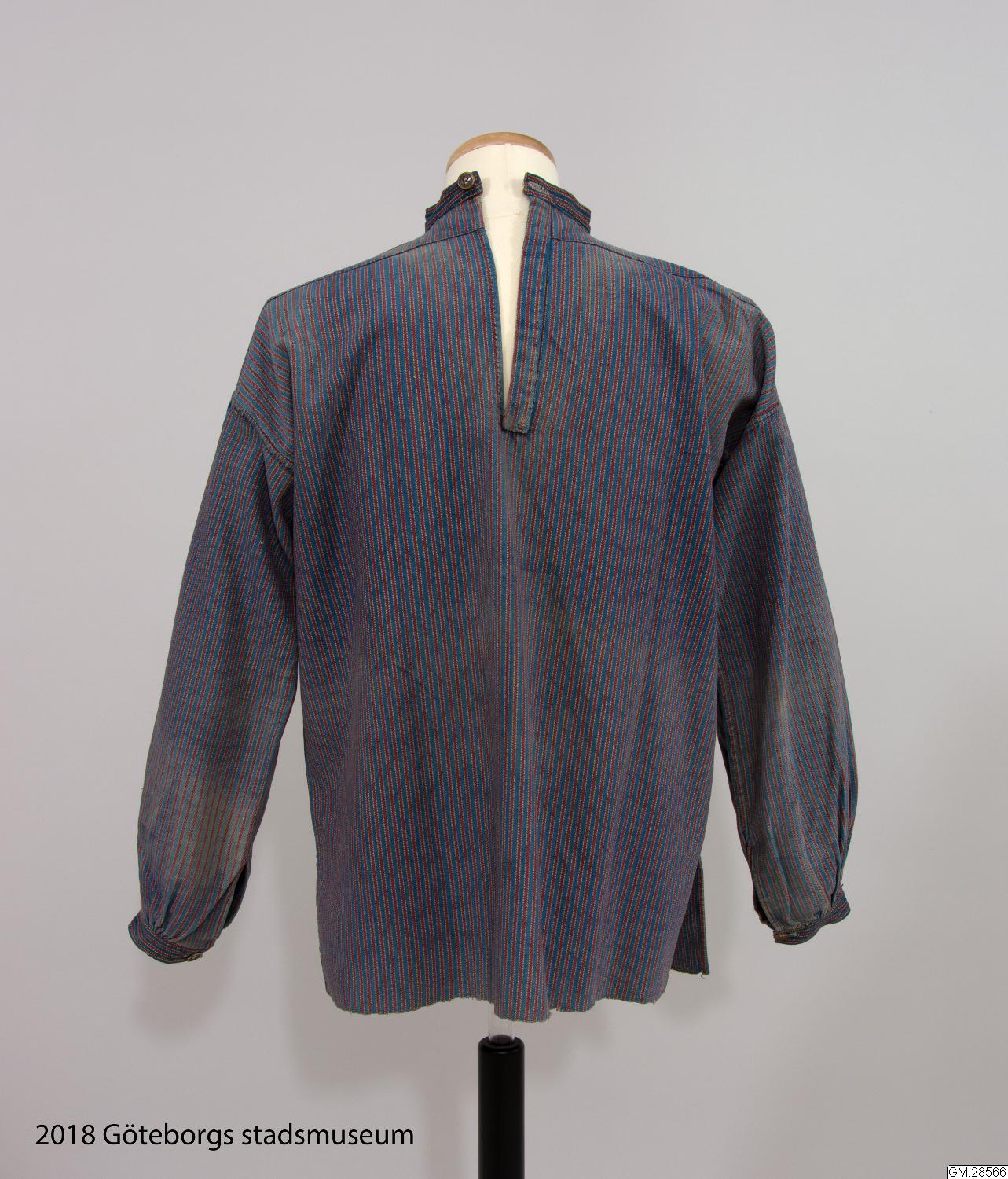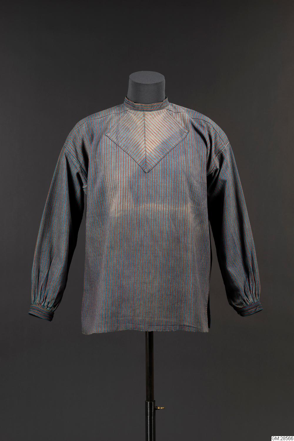 Shirt for a laboring man, made of sturdy blue cotton with thin red and yellow stripes. The shirt is made with low neckband, a diamond shaped reinforcement at the front of the chest, and an opening with a button at the top of the neck in the back.The long sleeves gathers into narrow wristbands with a single button.