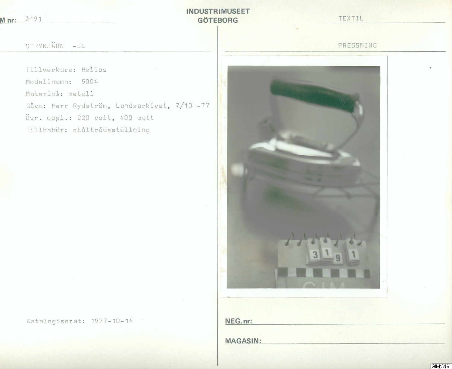 • Förvärvad 1977-10-07 av Rydström, herr.
