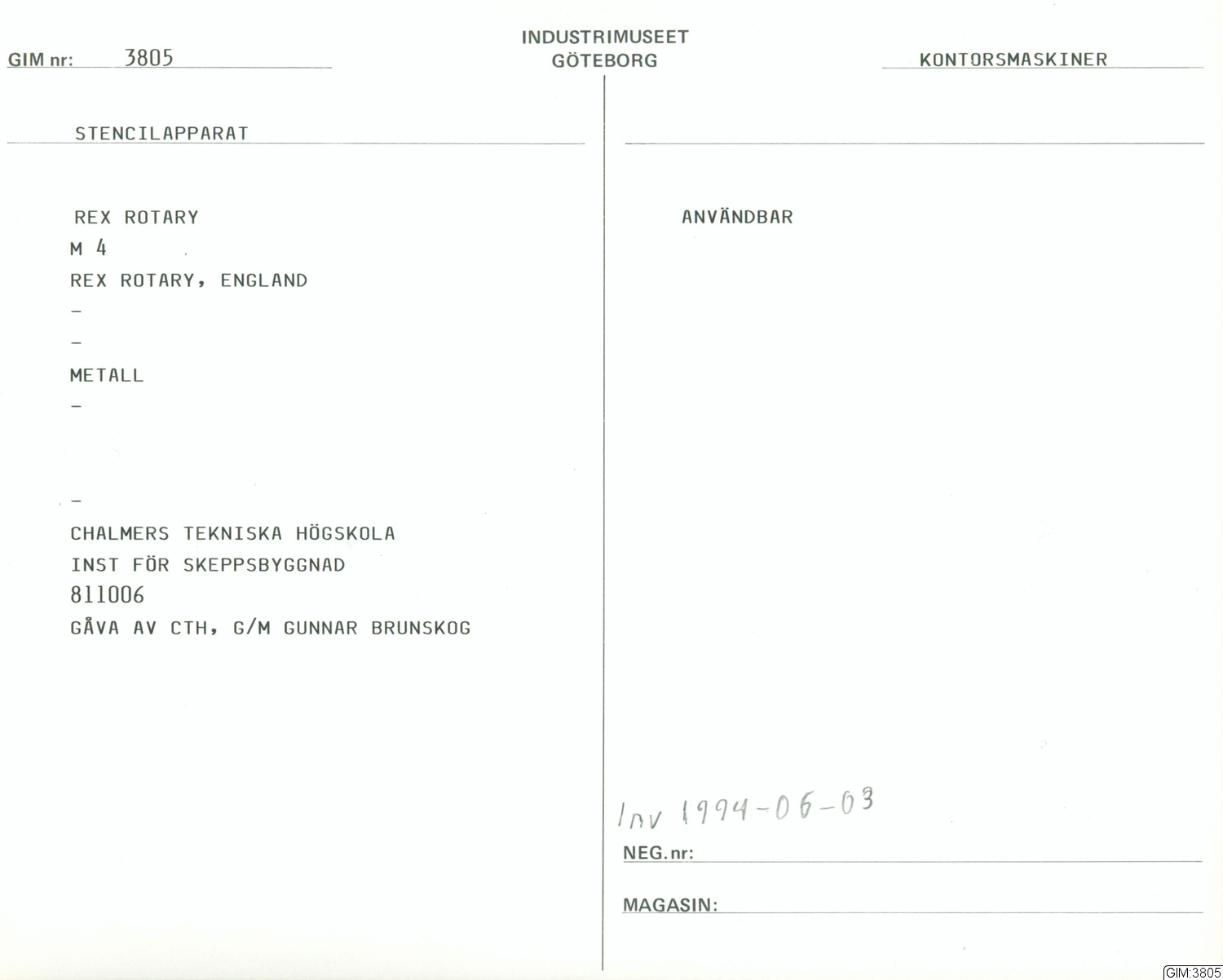 • Förvärvad 1981-10-06 av Chalmers Tekniska Högskola, Inst. för skeppbyggnadsteknik, Brunskog, Gunnar.
