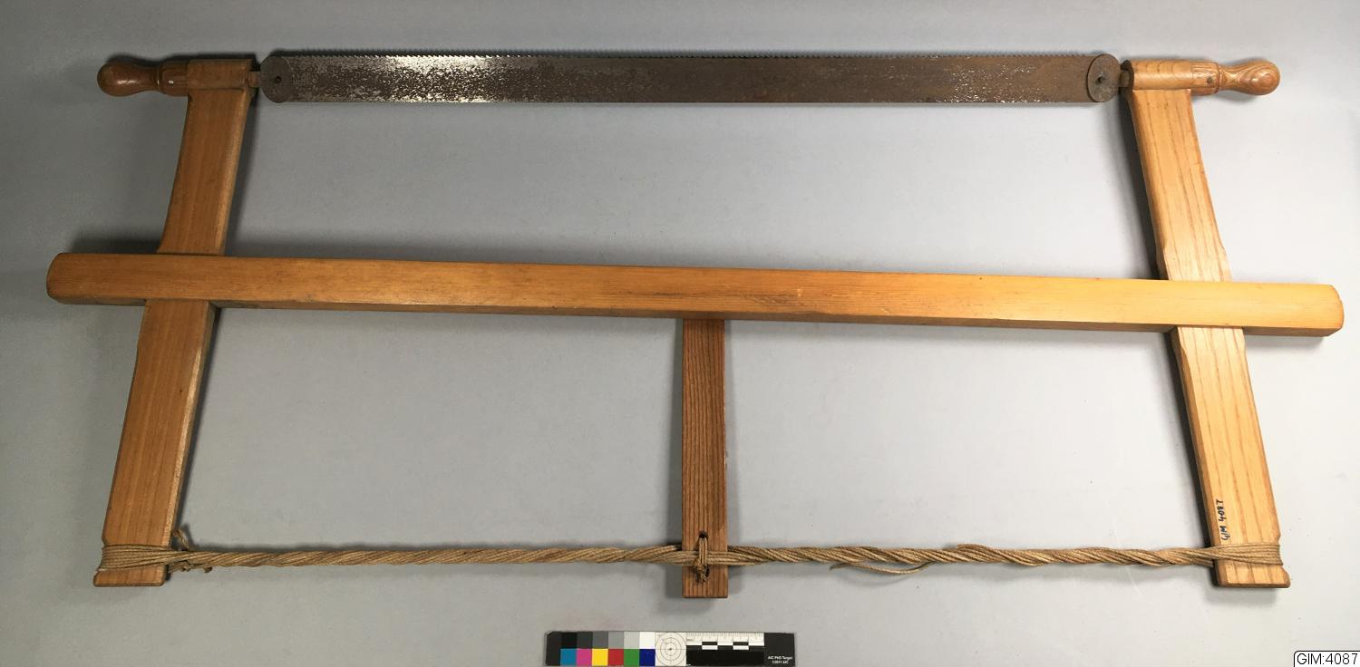 • Kompl. Snickarsågställning av trä. Sågklingan tillverkad Sandvikens Jernverk AB.