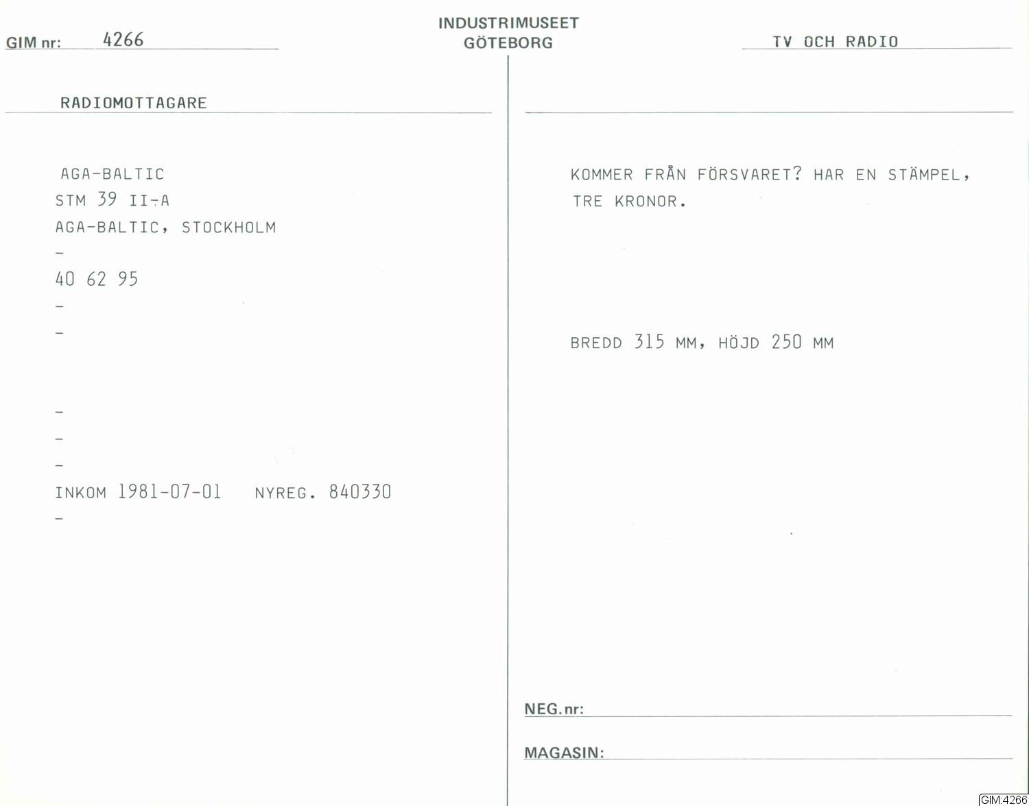 Tillverkad 1939 i Stockholm, Sverige av AGA-Baltic Radio AB.