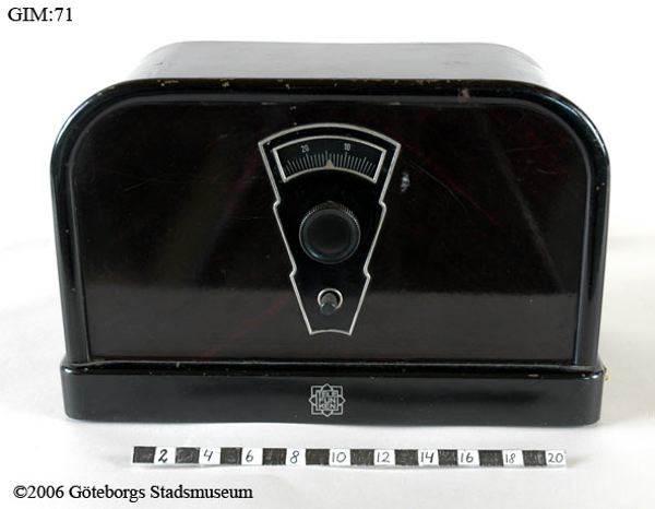 Elansl. 110-220V. Rörbestyckad mottagare. LV - MV#Plåtkapslad. Mörkbrun. Bakelitreglage. Stationsskala på front. Nätsladd. Uttag för hörlurar Rundradiomottagare#2000 ohm. Skador: smårepor runt om. Div skavmärke