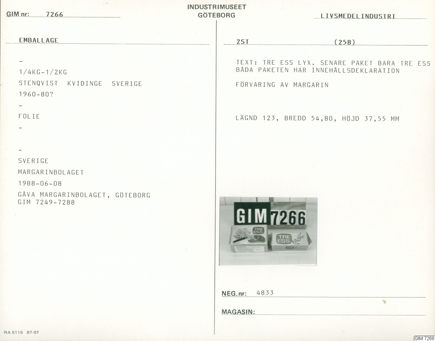 • Förvaringa av margarin med texten: Tre Ess lyx. Senare paket bara Tre Ess. Båda paketen har innehållsdeklaration