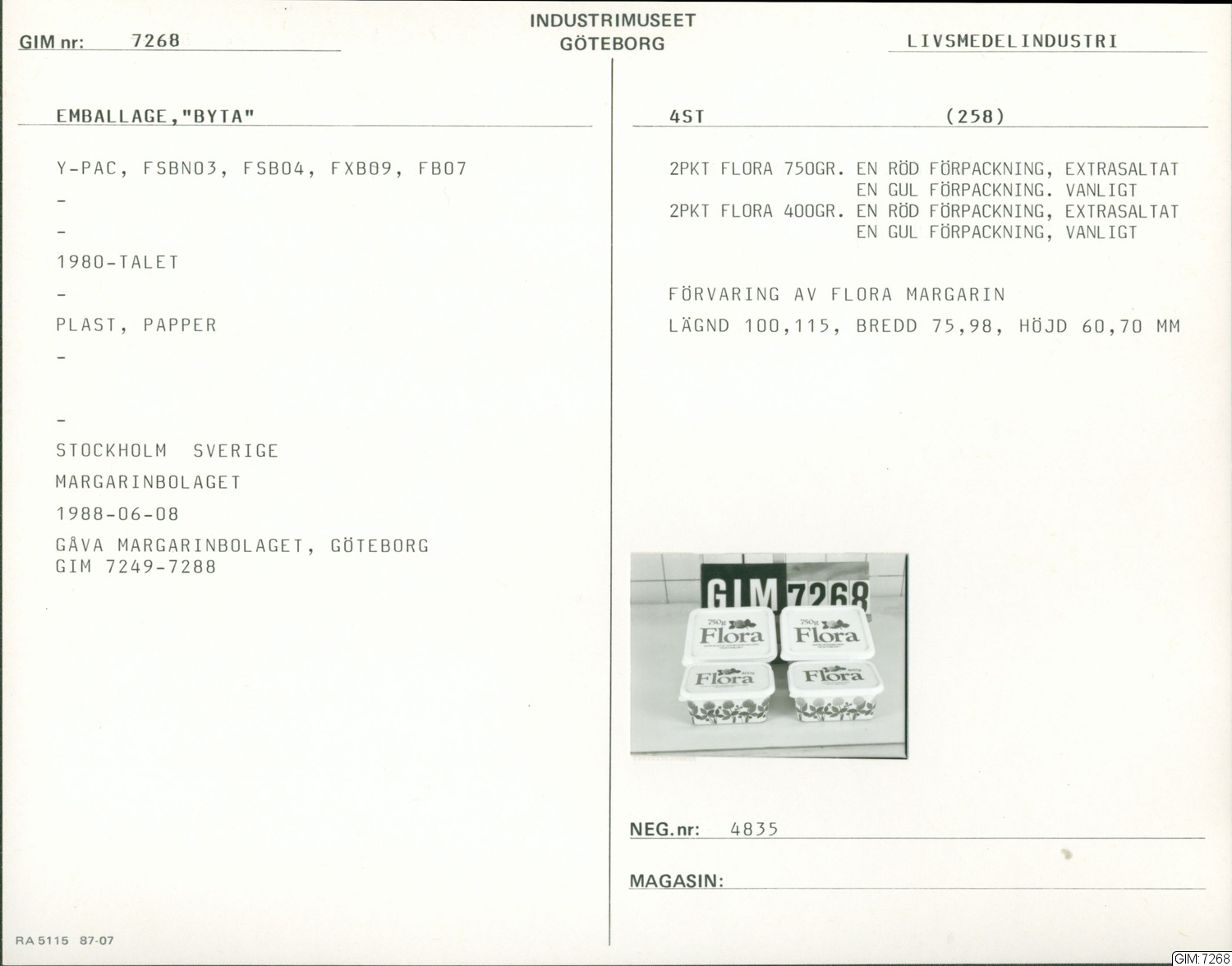 Emaballage eller "bytta" för förvaring av margarin. 2 paket Flora 75 Ogr. En röd förpackn- extra saltat. En gul förpackn- vanligt 2 paket Flora 400 g. En röd förpackn- extra saltat.En gul f