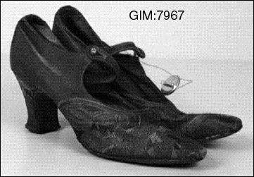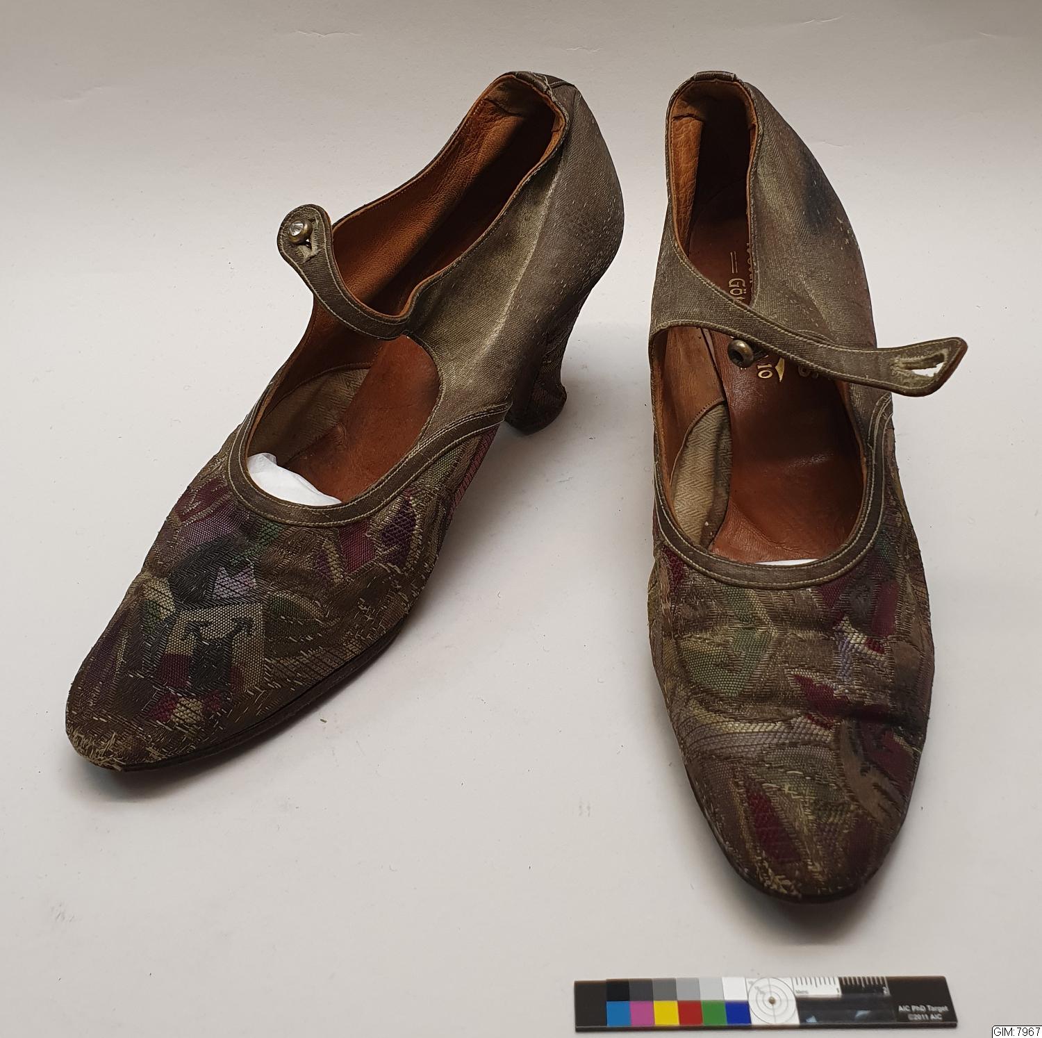 • damskor, hög klack av pompadourtyp, mönstrad silverbrokad. Glas i en knapp saknas