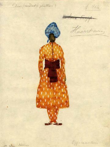 • Mansfigur i gulröd klädnad med fläckmönster i vitt, små knappar upptill, rödbrunt bälte, blå turban med svart-vita fläckar, bruna skor.