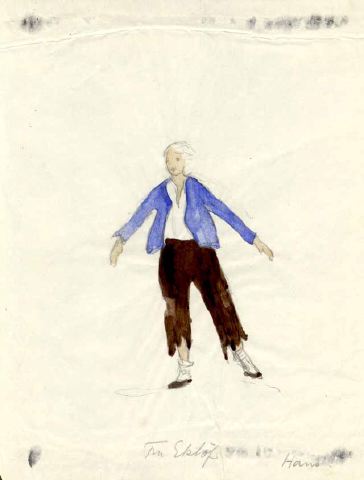 • Pojke i bruna lappade och fransiga byxor, vit skjorta, blå jacka, vita strumpor och bruna skor