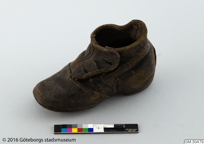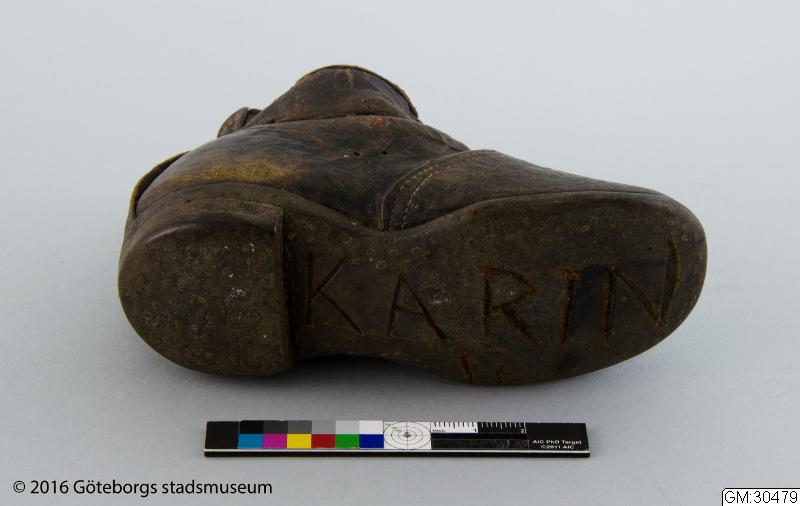 En barnsko i kraftigt mörkbrunt läder. Knäppkänga med sidoknäppning och stickning över tåpartiet. Under sulan finns en djup inristning med stora bokstäver "KARIN". /aan Från katalogkort: Barnsko, Låg knäppkänga av läder - mörkbrun. Knapparna (4 st) saknas. Pliggad sula och klack. L 13 cm "Karins första sko". "Karin 18" jämte två oläsliga siffror inristade i sulan.