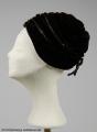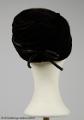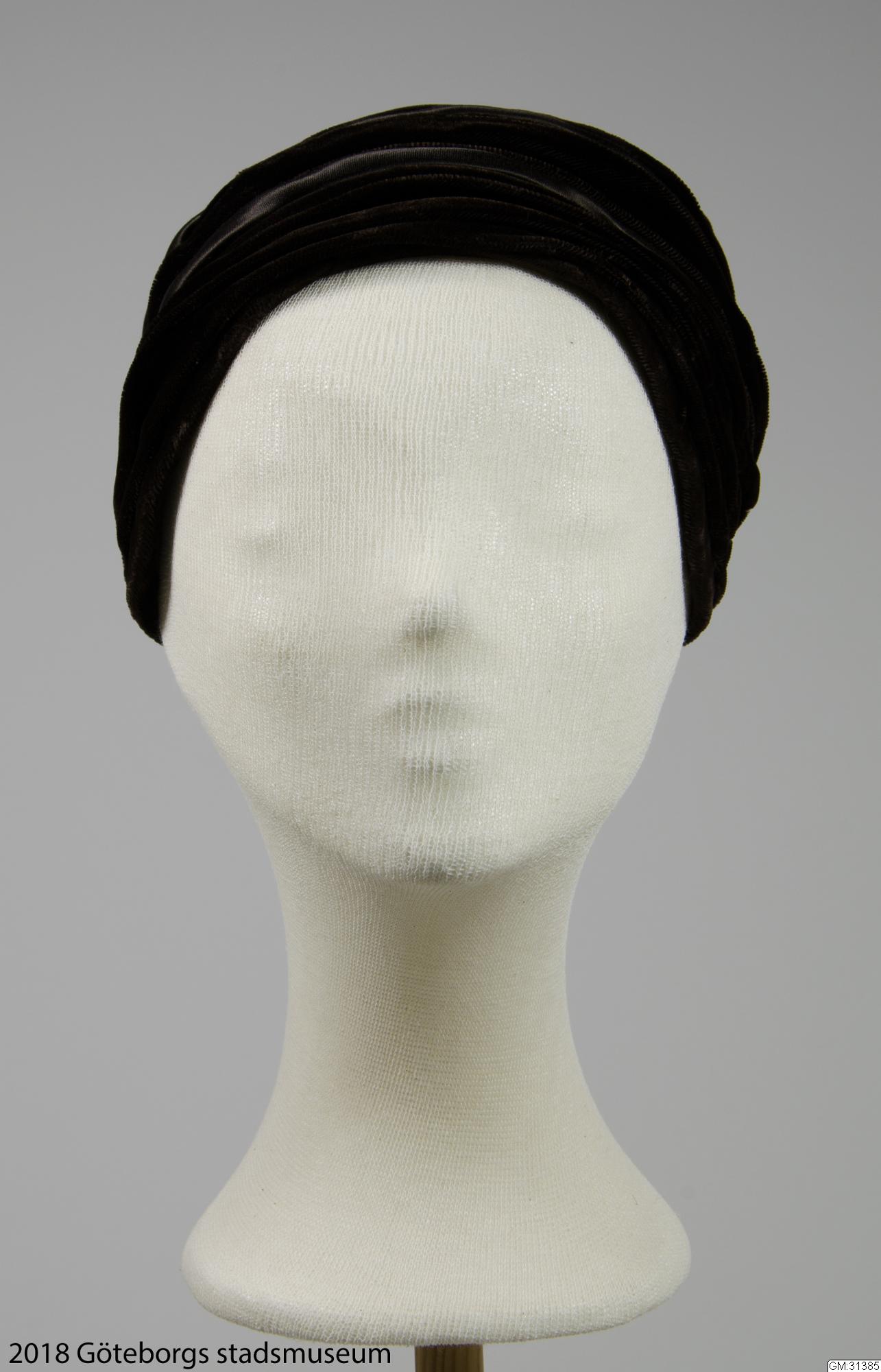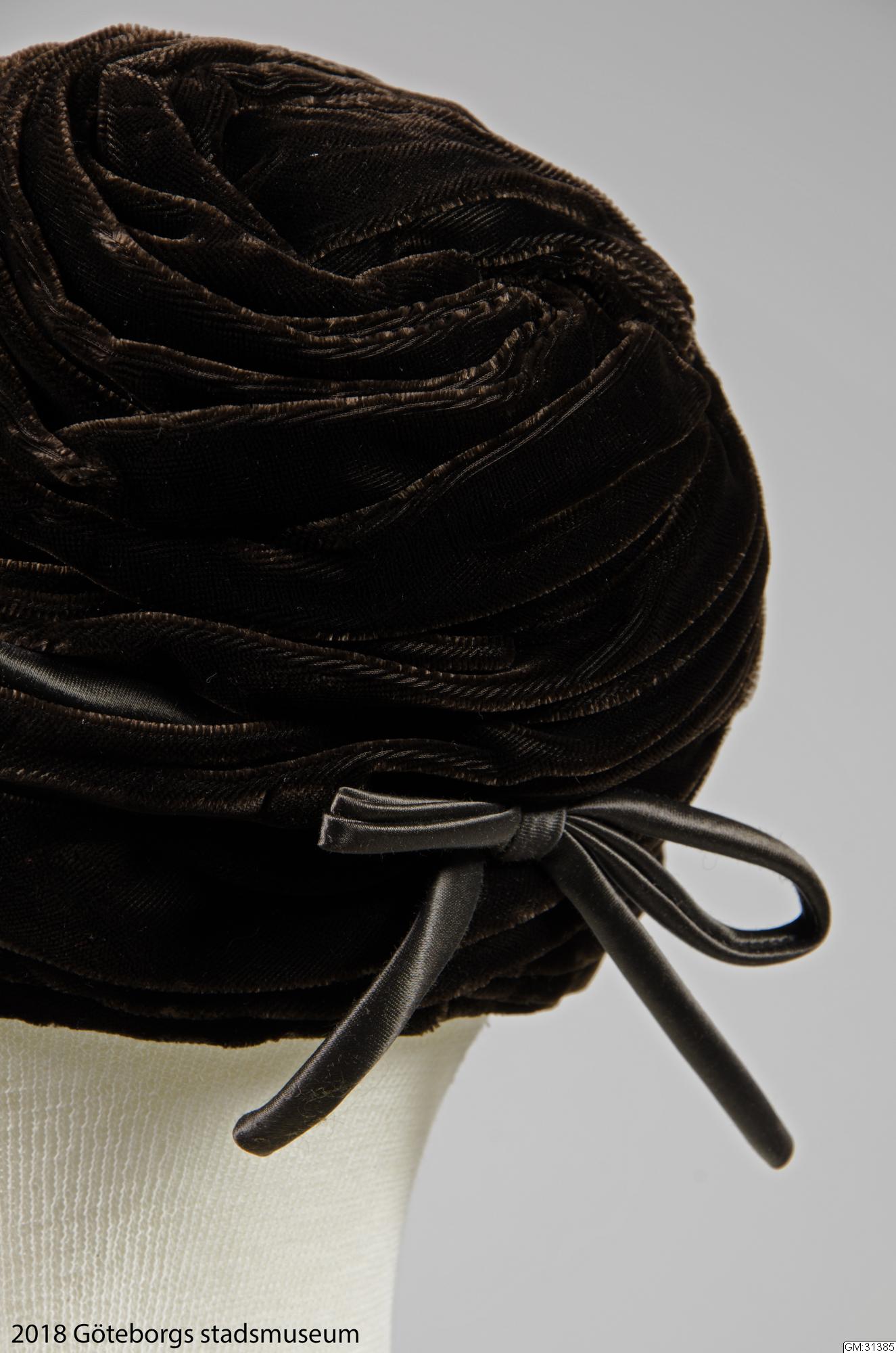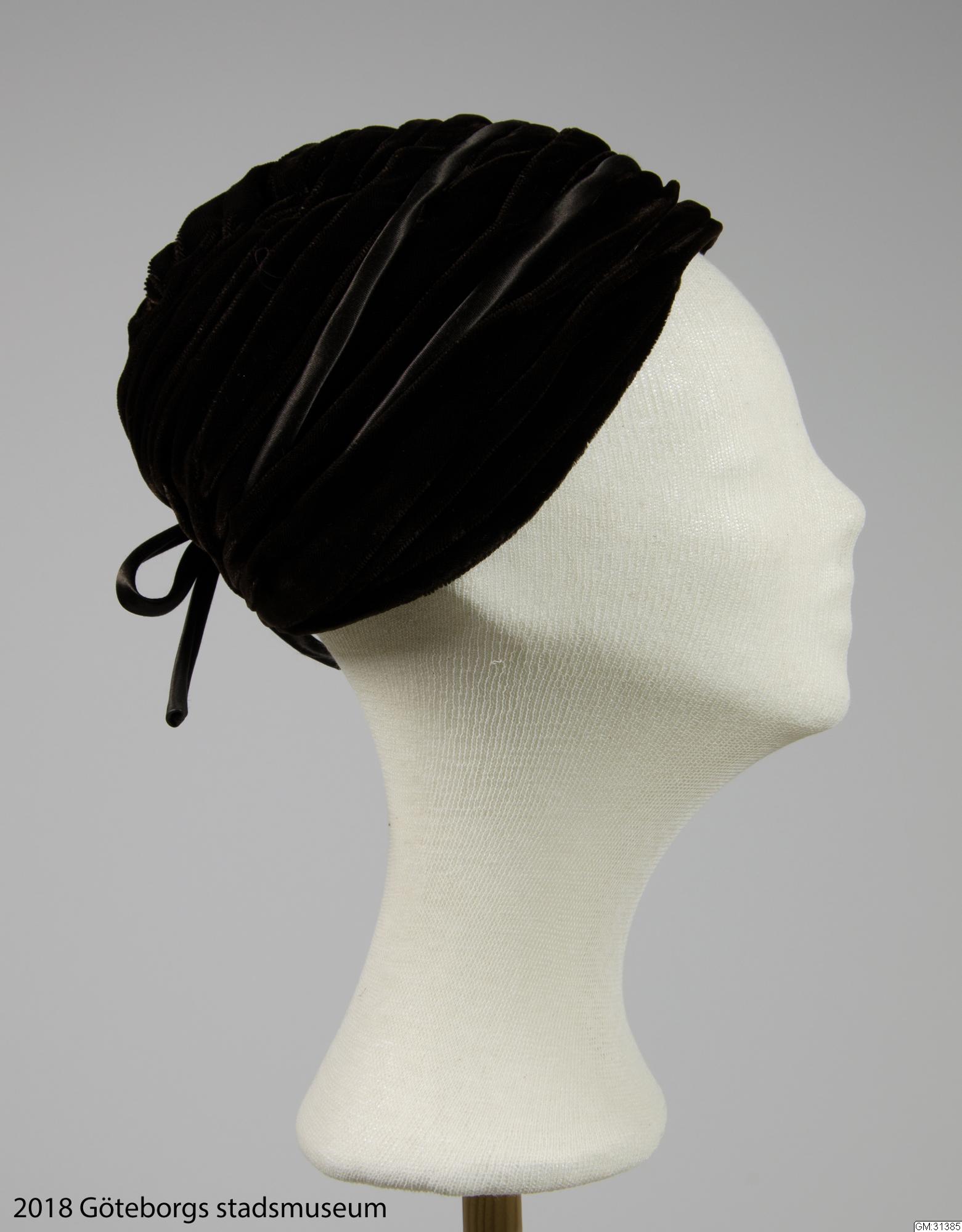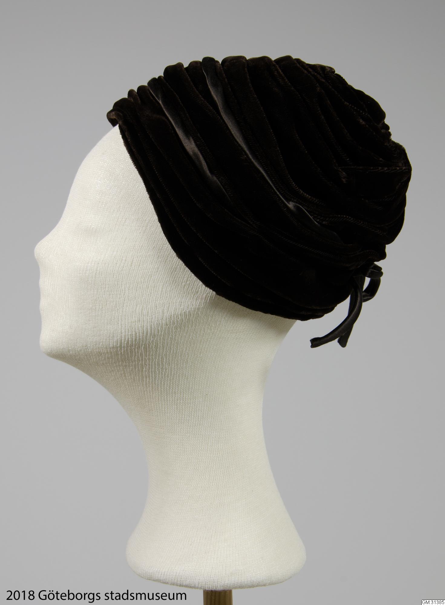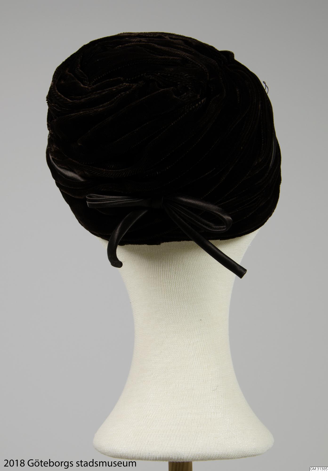Ladies hat early 1960: s. turban-shape made of dark brown silk velvet. Draped over a stiff material, lined with brown manmade silk. Bow made of rouleau of manmade silk, at the back of the neck. Label ...