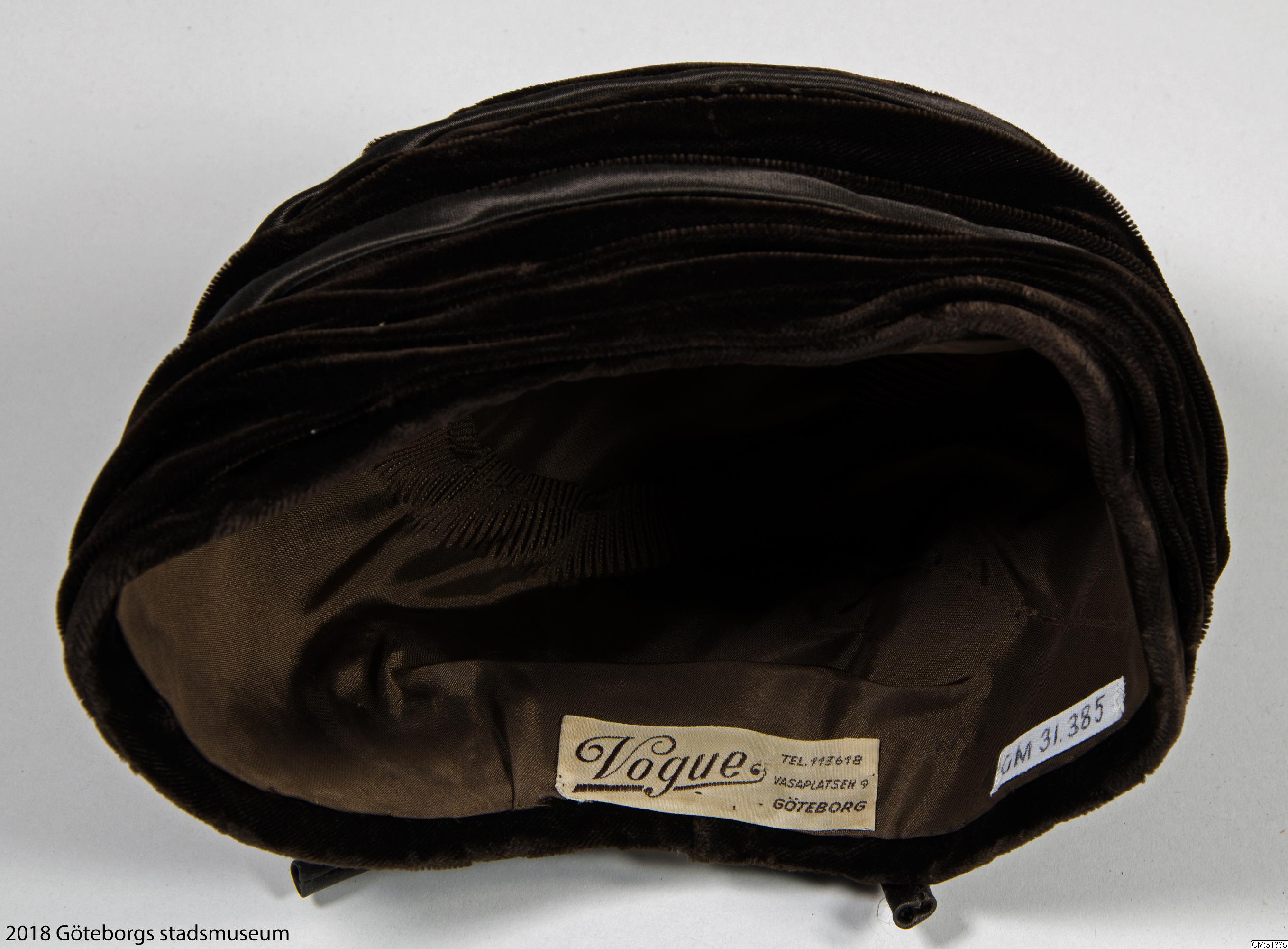 Ladies hat early 1960: s. turban-shape made of dark brown silk velvet. Draped over a stiff material, lined with brown manmade silk. Bow made of rouleau of manmade silk, at the back of the neck. Label on the inside “Vogue, Vasaplatsen 9, Göteborg”. gan 2020-04-14
