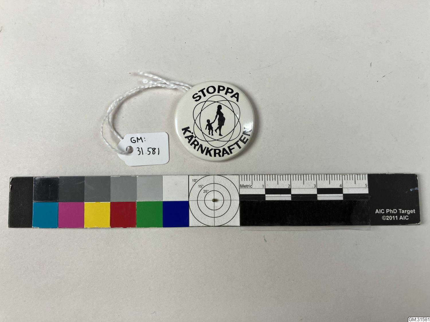 • Ett runt vitt rockmärke med texten "STOPPA KÄRNKRAFTEN" samt en gravid person och ett barn i svart siluett