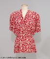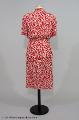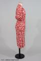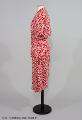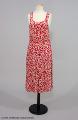 1) Solklänning i vistra, röd botten med vita akantusslingor. Rynkat liv med axelband. Dragkedja i vänster sida. Motveck mitt fram. Längd utan axelband: 100 cm, vidd: 98 cm, midja: 84 cm.
