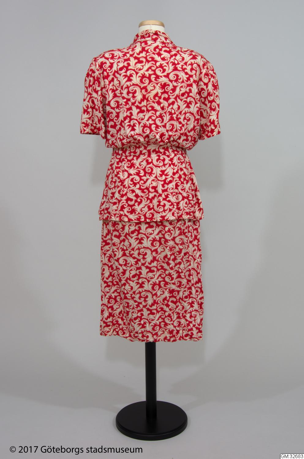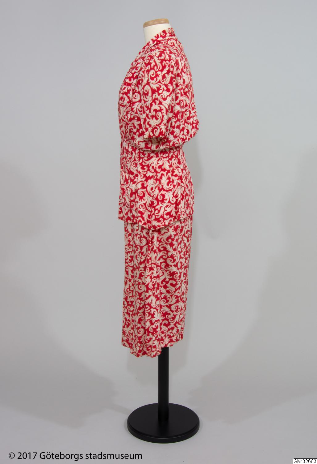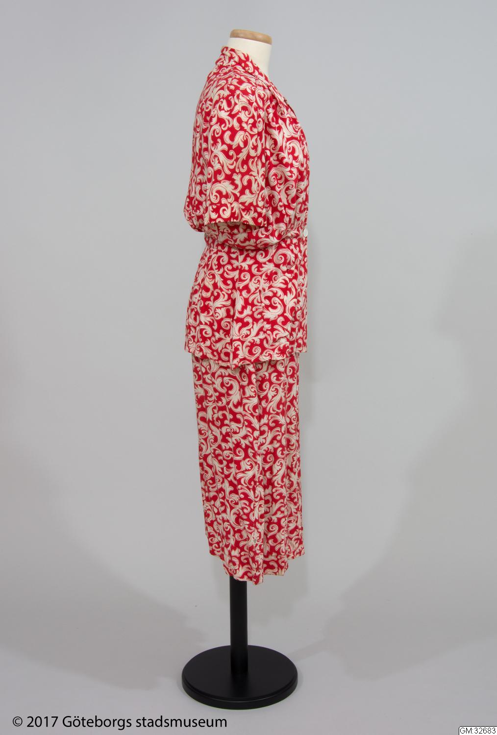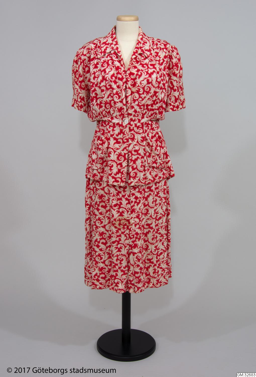 2) Jacka av samma tyg, avskuren och rynkad i midjan med krage och påstickade fickor på skörtet. Snibbkrage och knapp och knapphål i midjan. Korta ärmar me...