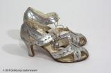 Från katalogkort: Aftonskor för dam, ca 1938. Sandalettmodell av silverfärgat skinn på höga smala klackar med delvis öppet perforetrat remförsett tåparti. Knytband med kulor av skinnet. Storlek 38, längd 25 cm, höjd 15 cm. Märkta Hedströms = tillverkare eller återförsäljare.