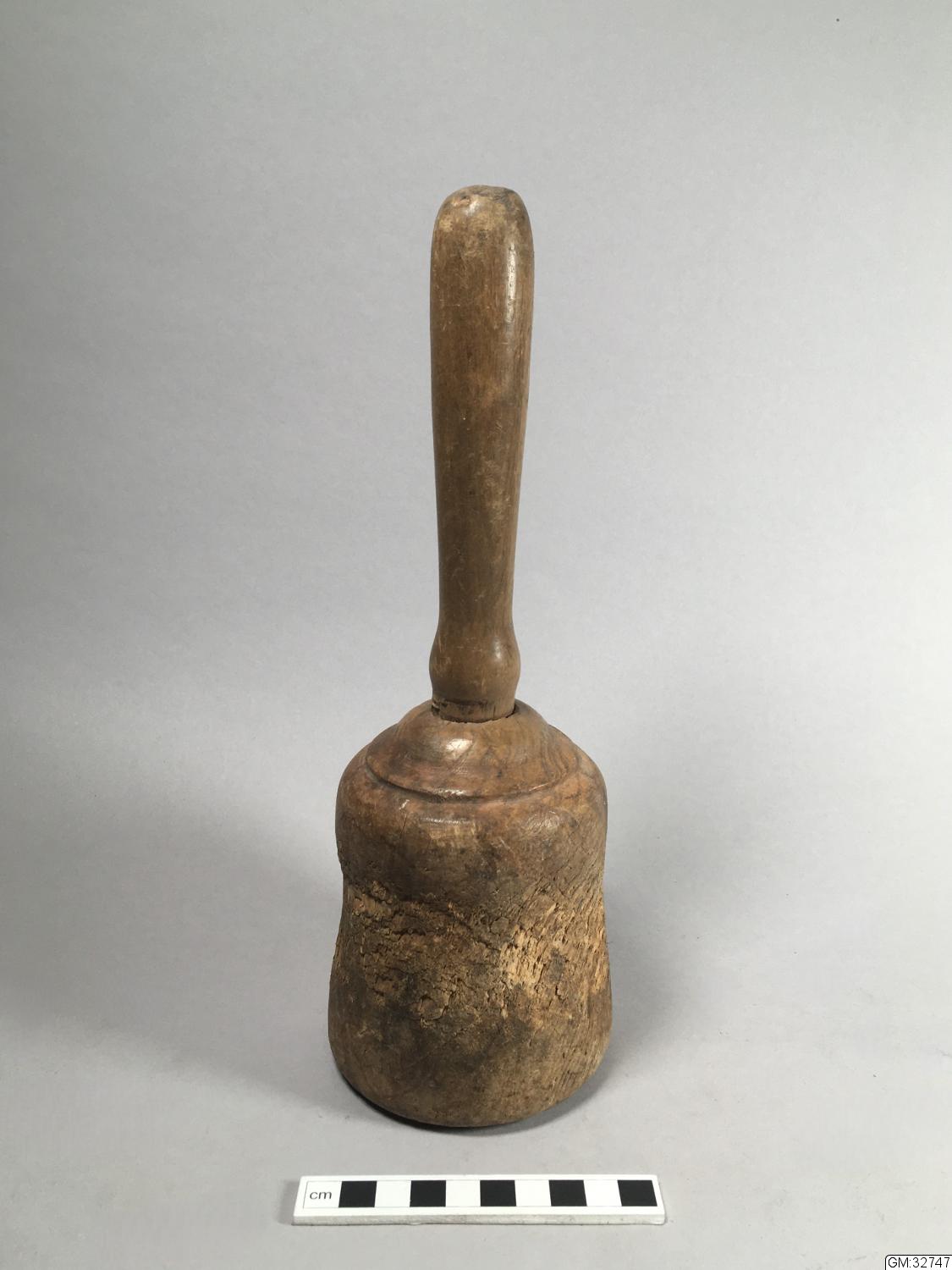 Stenhuggarklubba. Modifierat cylindrisk klubba av trä med mjukt rundade kanter. Svarvat handtag intappat tvärsigenom klubban i dess hela längd. Nött och med många slagmärken. Avsedd att slå på järnet vid bearbetning av lössten (t ex sand- och kalksten samt marmor). Foto se GM 32 741