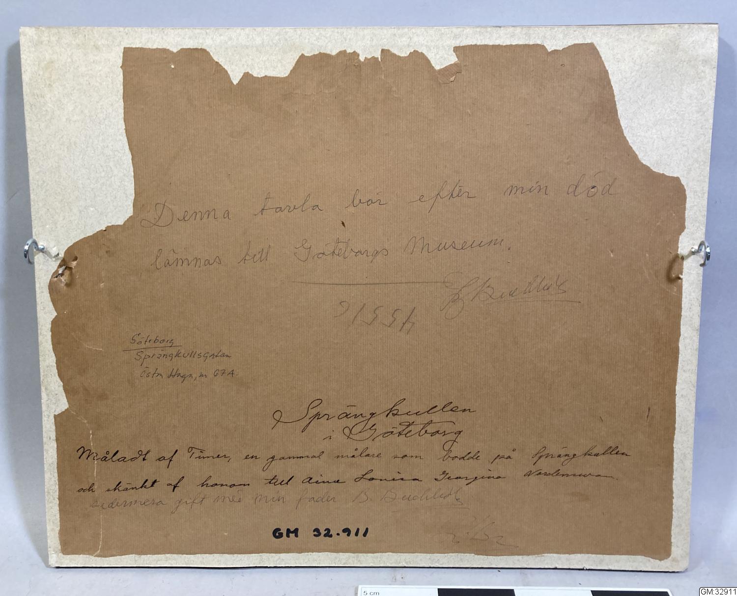 • Måladt af Timer, en gammal målare som bodde på Sprängkullen och skänkt af honom till Anna Louisa Georgina Nordensvan sedermera gift med min fader B. Buchholz. [Enligt påskrift på baksidan]
