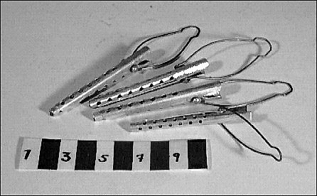4 st silverfärgade papiljotter av aluminium och ståltråd. Fungerar som klämmor, vilka håller fast hårtoppen, som sedan rullas runt dem. Den ena märkt "Pat. Pending, made in England."