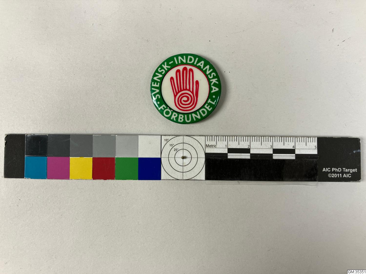 • runt rockmärke av metall med grön vit och röd färg. "SVENSK-INDIANSKA FÖRBUNDET"