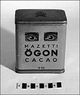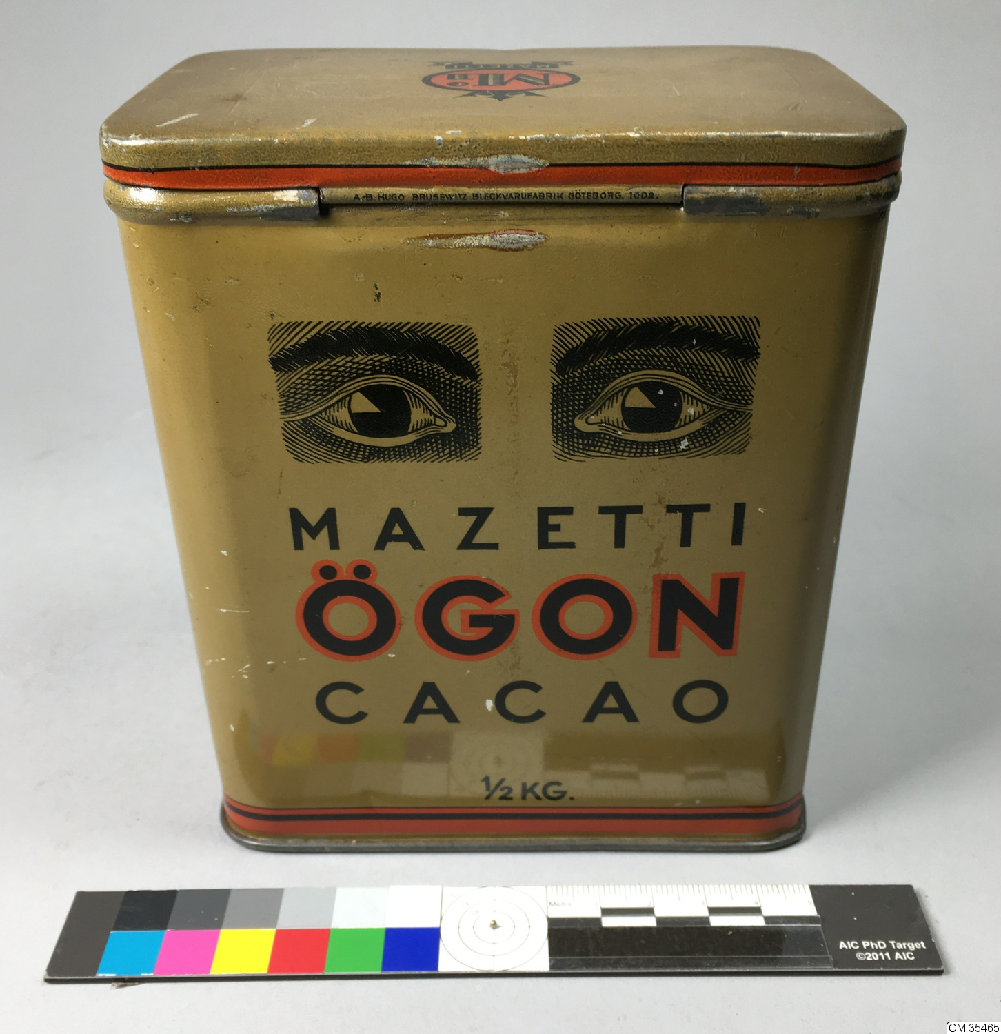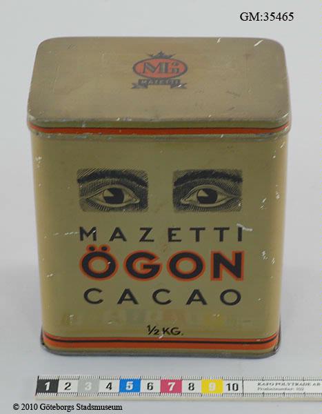 • Rektangulär grå-brunfärgad kakaoburk av plåt med texten "Mazetti Ögoncacao 1/2 kg" i rött och svart.