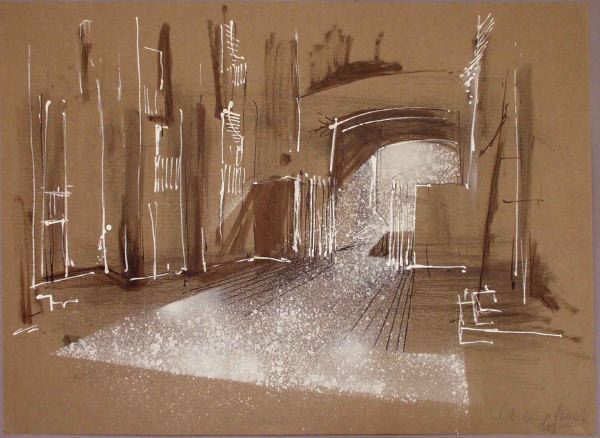 På vänster sida en vägg som går diagonalt mot bakgrunden och en bred bågformad öppning (valv) varigrån ett vitt sken kommer in och sprider sig på scengolvet. Skissen utförd i grå och bruna nyanser med linjer i vitt och svart på grått papper.
