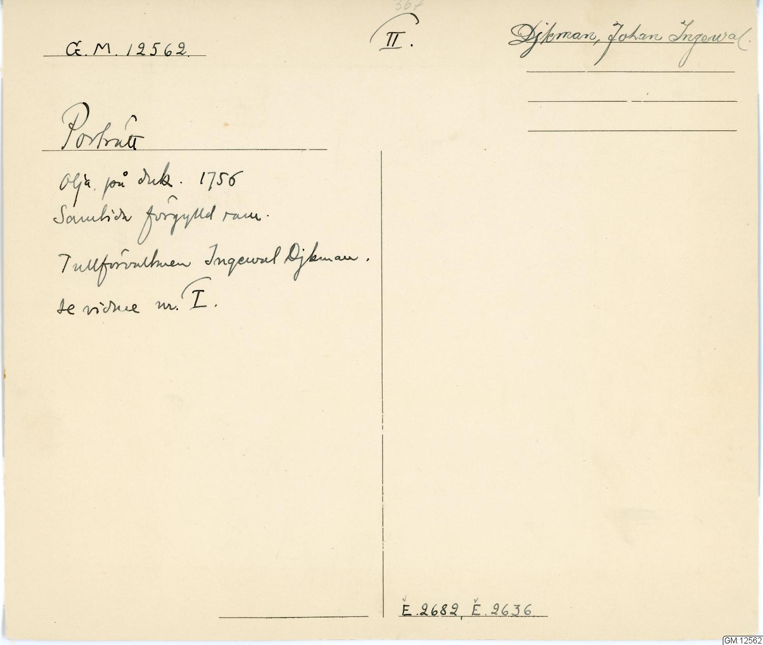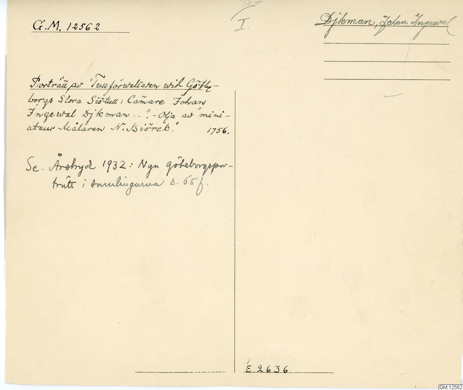 på dukens baksidan: Tullförvaltaren vid Götheborgs Stora SiöTull:Cammare Iohan Ingewal Djkman är född i Gefle stad 5 Iulj år 1710 samt Trädt i ächta Stånd med Maria Elisabeth Lohm uti Stockholm den 7 october 1735 och blifvit aftagen i Götheborg 1756 af Miniateur Målare N.Biörck.