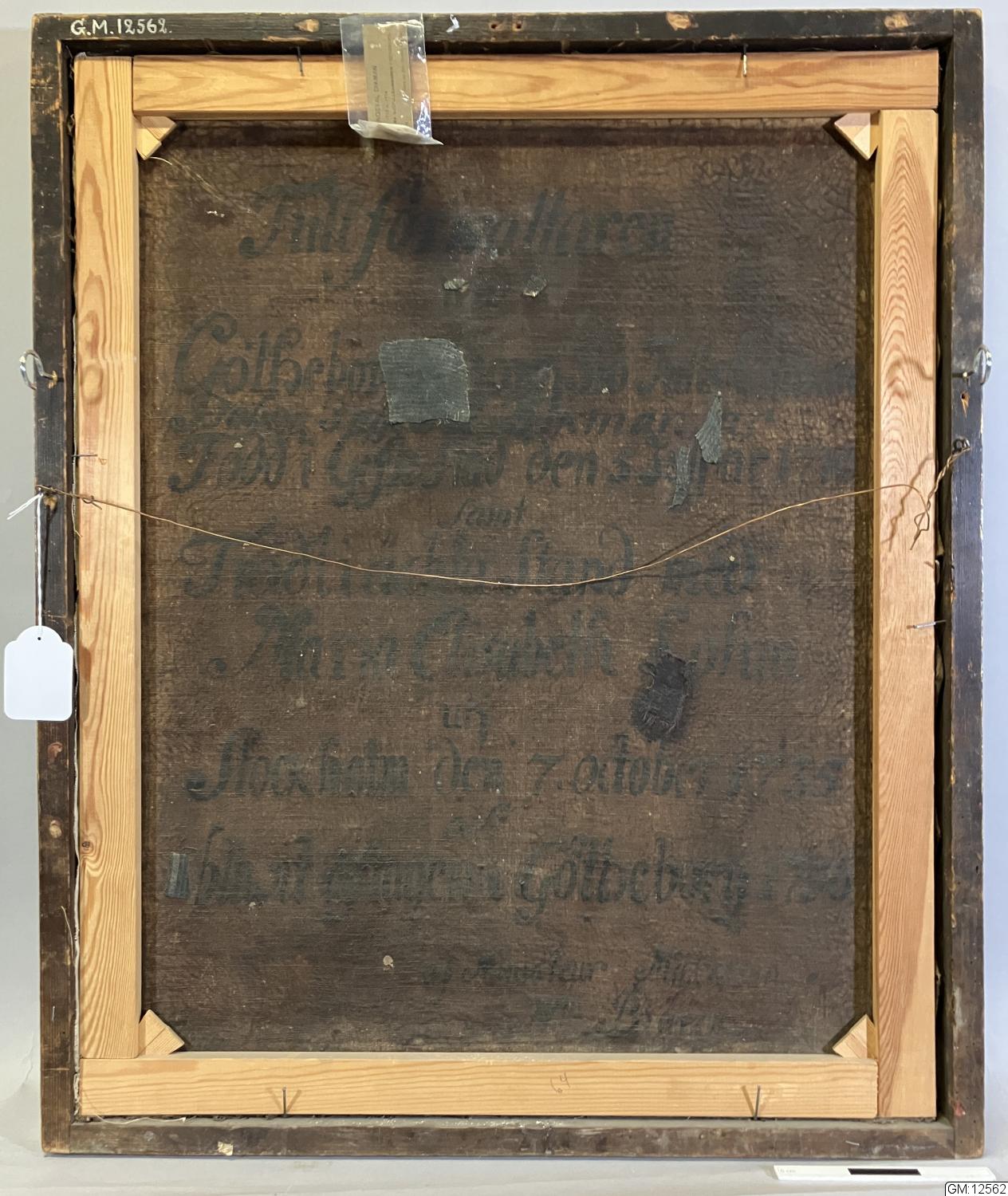 på dukens baksidan: Tullförvaltaren vid Götheborgs Stora SiöTull:Cammare Iohan Ingewal Djkman är född i Gefle stad 5 Iulj år 1710 samt Trädt i ächta Stånd med Maria Elisabeth Lohm uti Stockholm den 7 ...