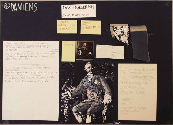 I mitten en svart/vit kopiering av ett porträtt av en man i 1700-talskostym som sitter i en karmstol, kopieringen är delvis färglagd med grå rock och knäbyxor, lila- och silverfärgad långväst, blått ordensband. (se ytterligare beskr, under påskrift) Ovanför finns en litet porträtt (repro) i färg av Le comte d`Argenson. Förutom dessa, är vita ark och smålappar med påskrifter limmade på svart papper, samt tygprover fästa med knappnålar.