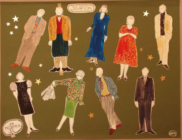 Nio kostymskisser från Stadsteaterns uppsättning av "En fröjdefull jul" 1994. Uutförda på vitt papper, utklippta och upplimmade på grönt papper tillsammans med guldstjärnor. De nio är samtliga rollfigurer i pjäsen och alla iklädda kostymen från AKT 1 scen 1.