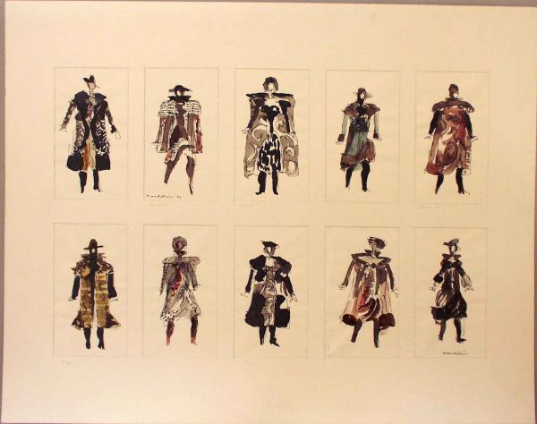 • Tio kostymskisser, något schematiska, i två rader, i övervägande ljusgrått, beige och svart.